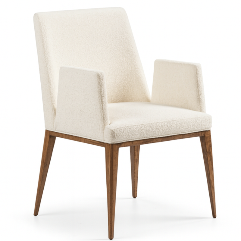 Стол с подлакътници, масивна конструкция от ясен, тапицирана седалка и облегалка. Избор на тапицерия и цвят на краката.
