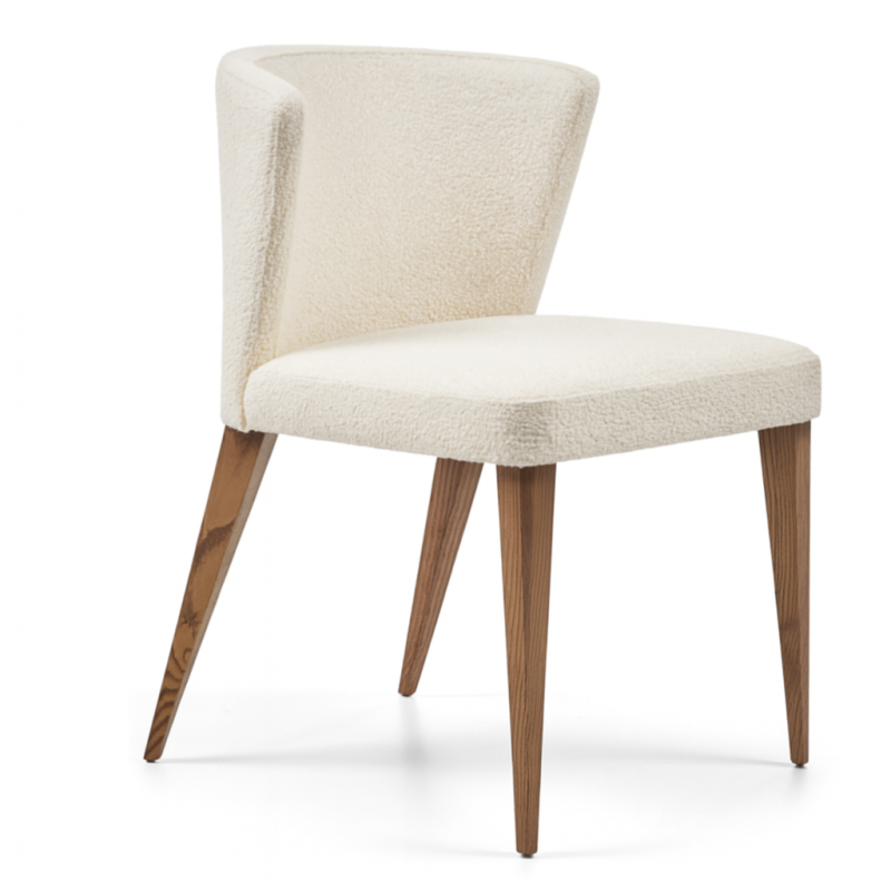 Стол без подлакътници, масивна конструкция от ясен, тапицирана седалка и облегалка. Избор на тапицерия и цвят на краката.