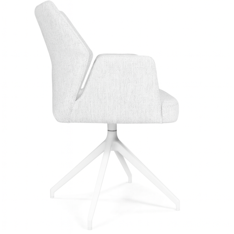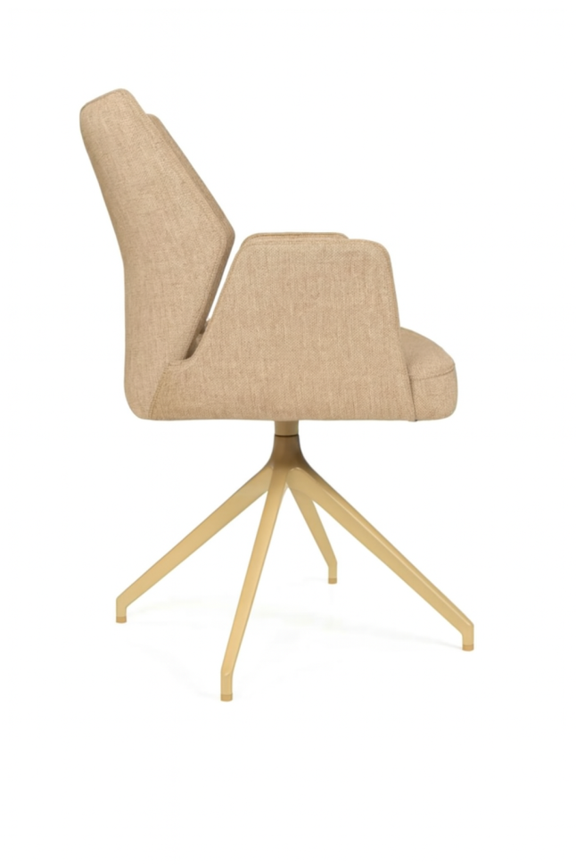 Въртящ се Стол с подлакътници, метална основа, масивна конструкция от ясен, тапицирана седалка и облегалка. Избор на тапицерия и цвят на краката.