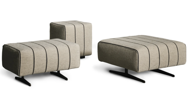 Mark е колекция от аксесоари за всекидневни и спални зони. Предлагат се както като пуф, така и като пейка, повдигната от земята благодарение на необичайна метална основа, те са триумф на шивашкия стил, подчертан от безценните детайли, които характеризират цялата колекция. Раираната шарка с двоен шев е индикация, която придава специфична естетическа идентичност на предмета, независимо дали избирате тапицерия с контрастни шевове или тон в тон. Калъфът на табуретката за крака и пейката в хола, предлага се в множество цветови вариации, е изработен от плат или кожа и може да се сваля напълно.