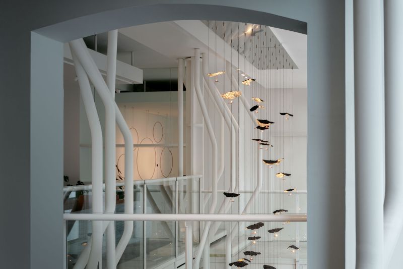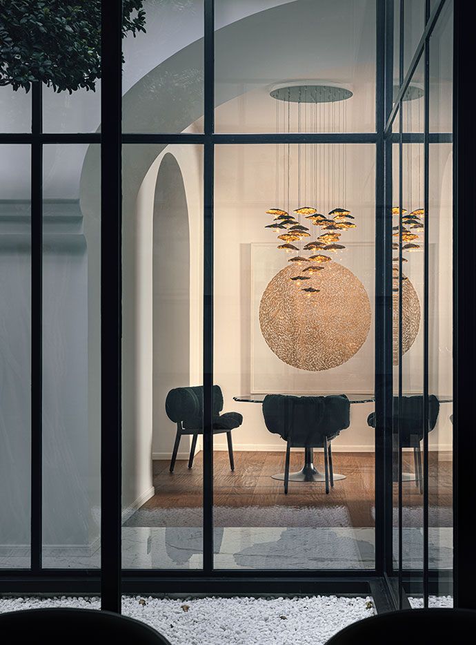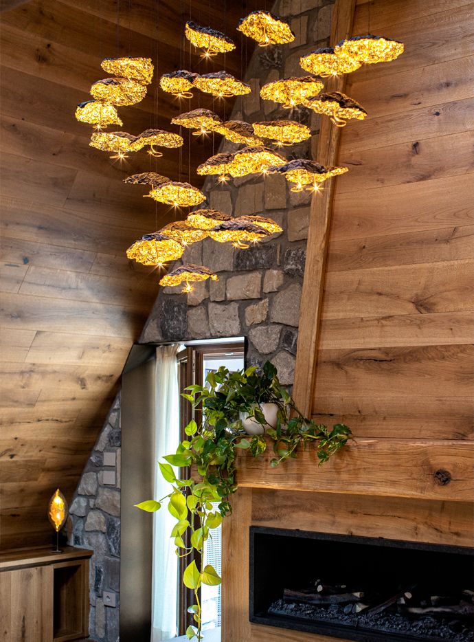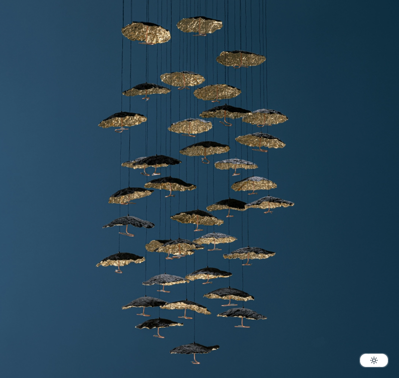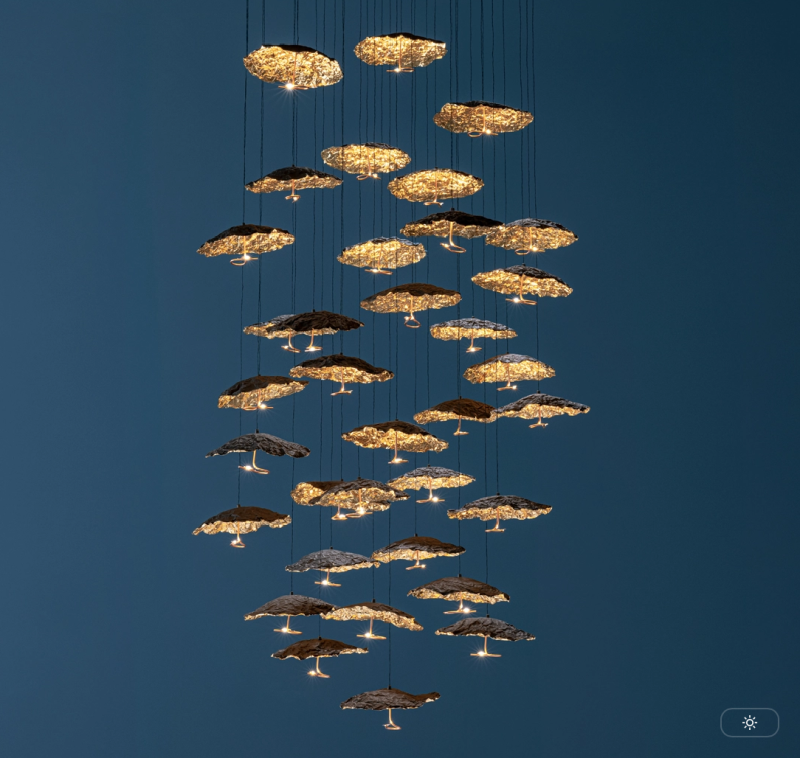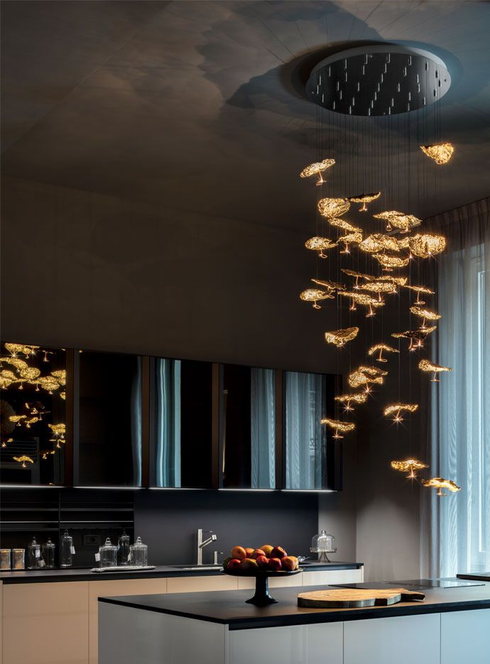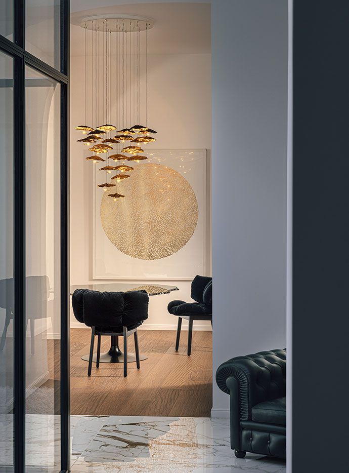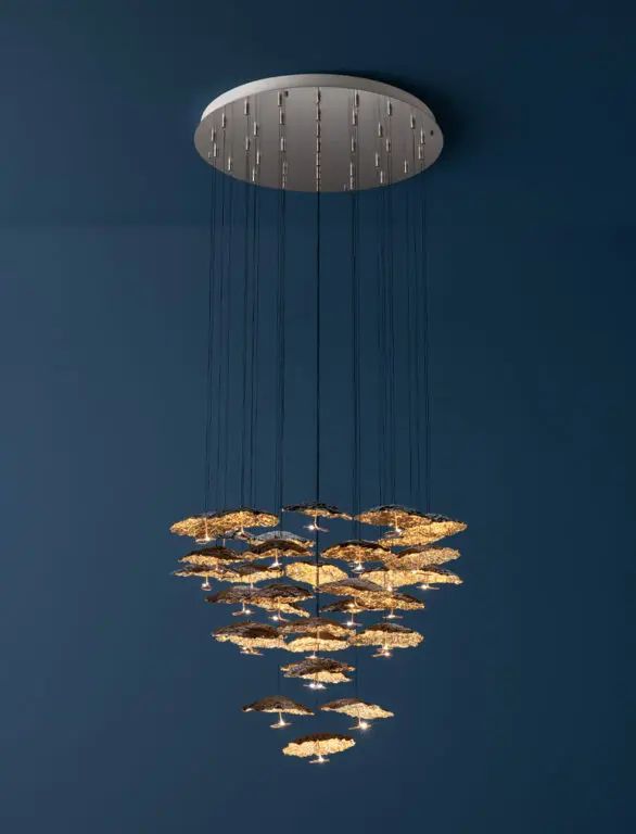 Полилеят Gold Moon внася отличителен нов обрат в концепцията на традиционния полилей, превръщайки го в поразителна каскада от висяща светлина. Може да бъде създаден в различни модели, с различни основи, покрития и брой елементи и се състои от поредица от дискове с неправилни форми, на които са окачени тънки кабели с различна височина, завършващи с красиви медни къдрици, обгръщащи малки LED светлини. Вътрешната повърхност на дисковете, покрита ръчно със златни листове, се захваща със светлината, излъчвана от светодиодите, усилвайки я и създавайки примамлива атмосфера.