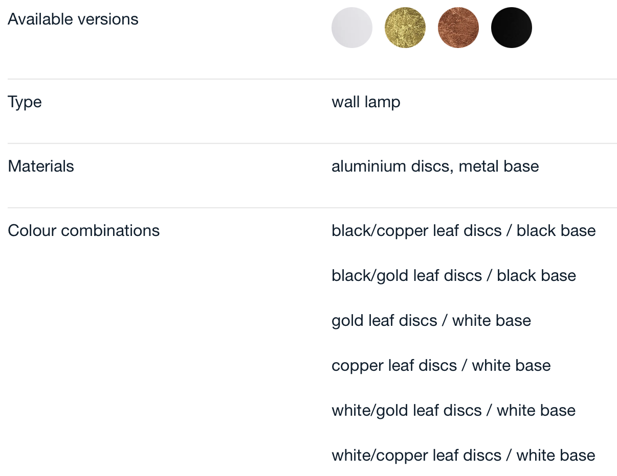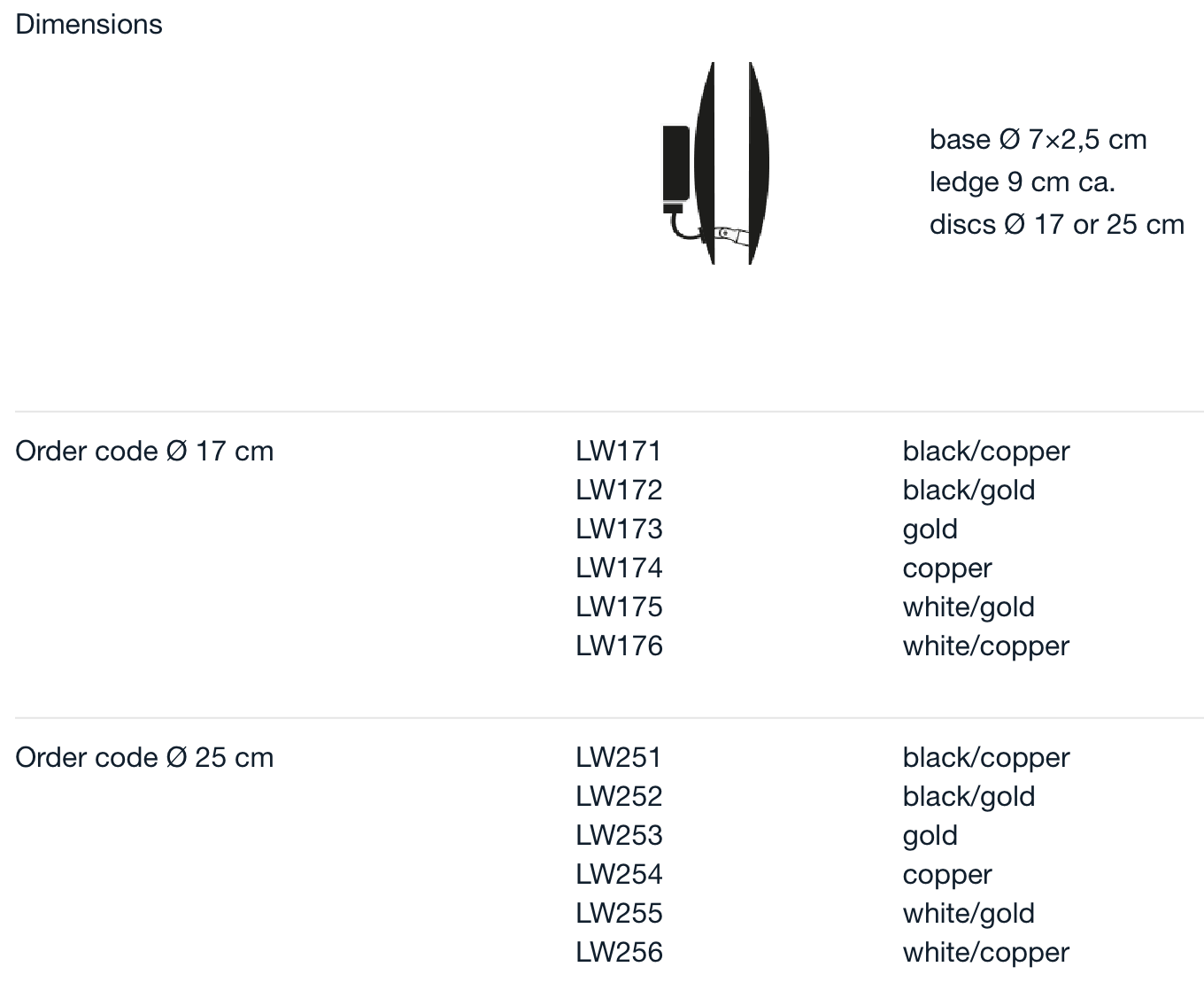 Посочената цена е в начална категория финиш: LW171 / discs Ø 17 cm D1 black/copper - D2 copper/black / black base / 1x15W LED board LW172 / discs Ø 17 cm D1 black/gold - D2 gold/black / black base / 1x15W LED board