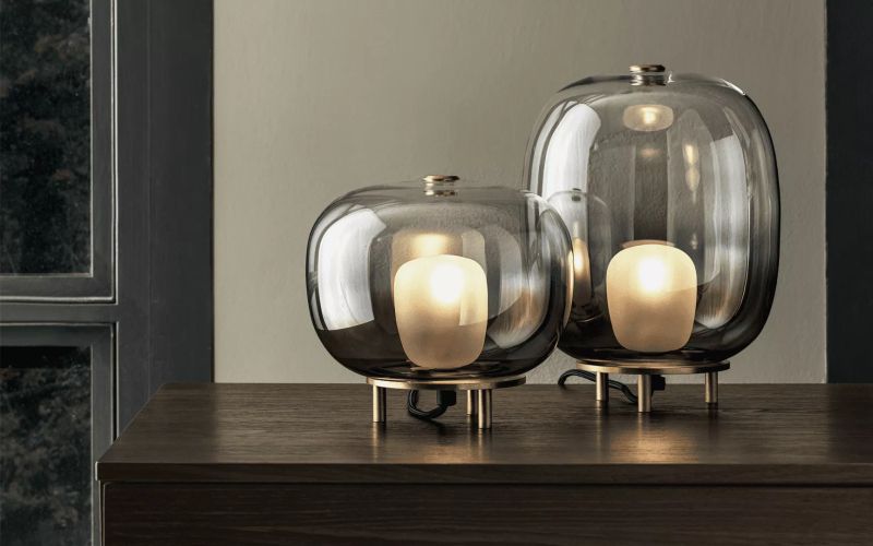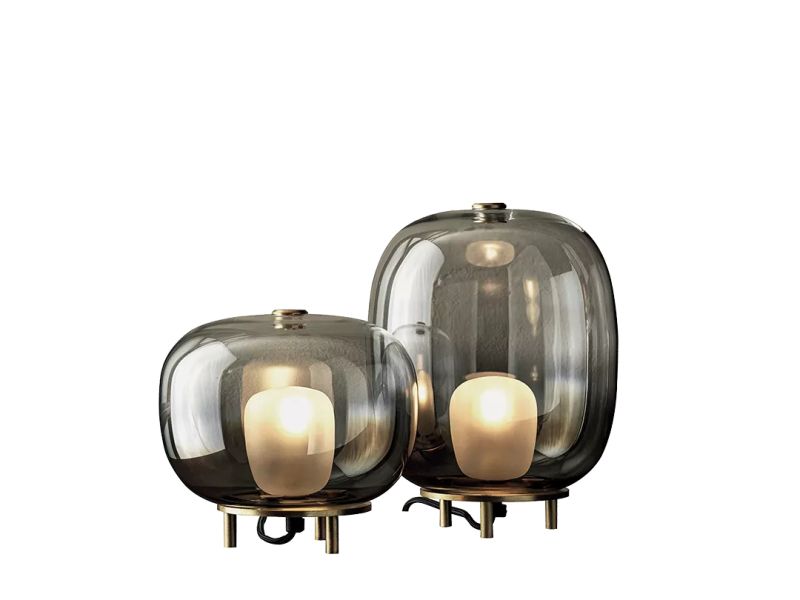 Настолна лампа с боросиликатно стъкло, рамка от естествен месинг и таванна розетка.