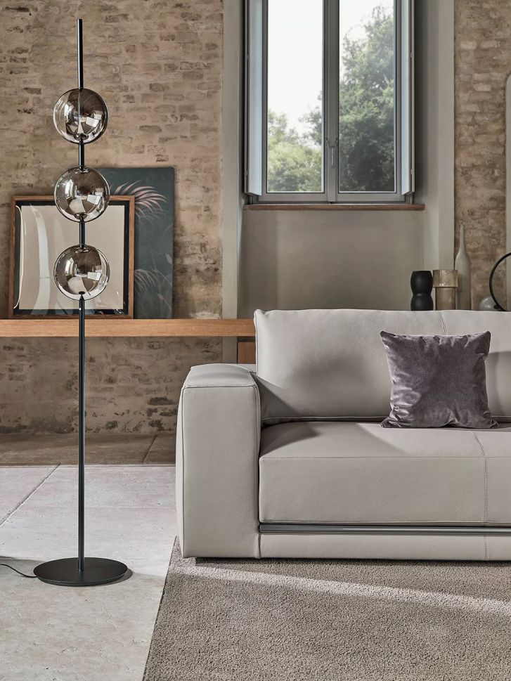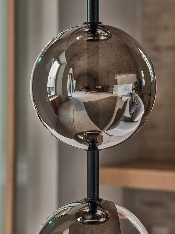 Подова лампа с метална рамка и 3 частично огледални сфери от боросиликатно стъкло.