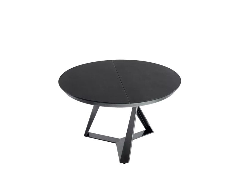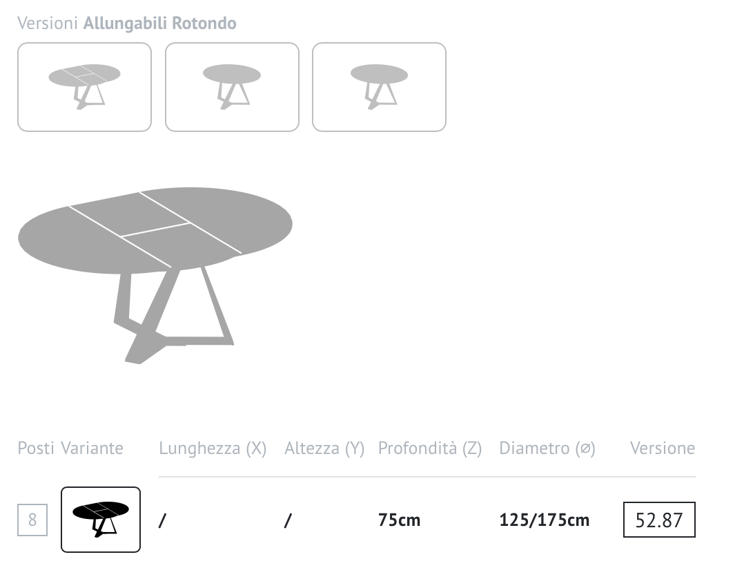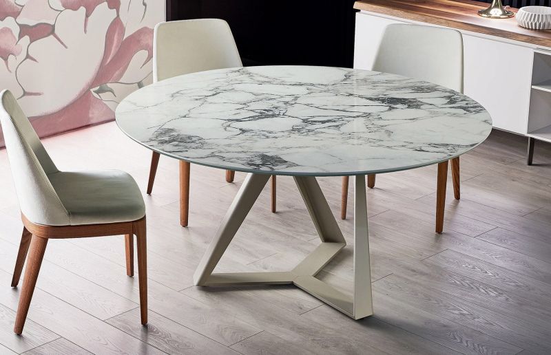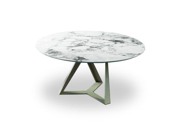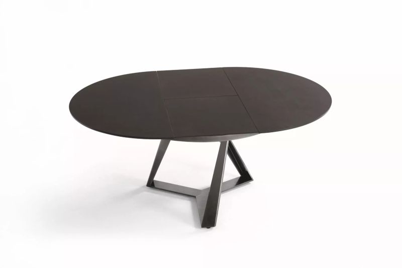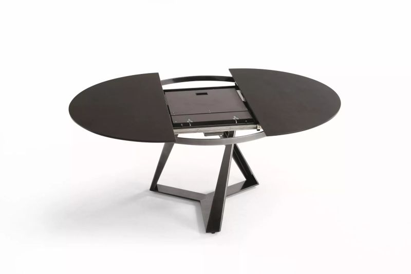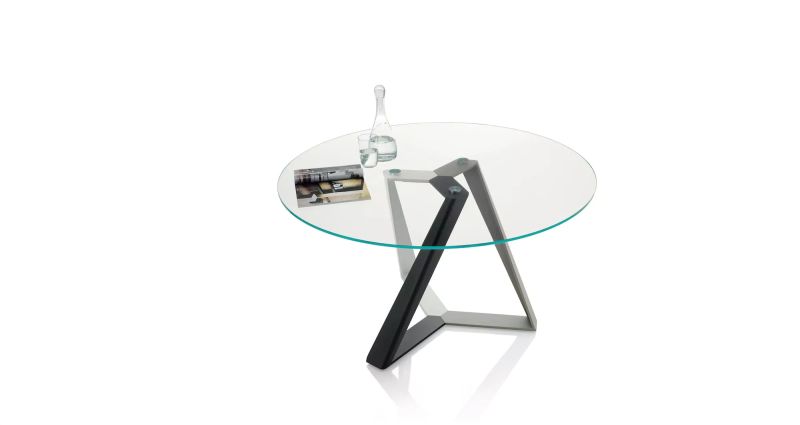 Кръгла или елипсовидна маса във фиксирана или разтегателна версия, с лакирана метална рамка. Плот от фурнировано дърво, гланцово стъкло, кадифено матово лакирано стъкло с устойчивост на надраскване или супермрамор и фиксирана кръгла маса с централен въртящ се плот от стъкло, стъкло с устойчивост на надраскване или супермрамор, пръстеновиден плот от фурнировано дърво.