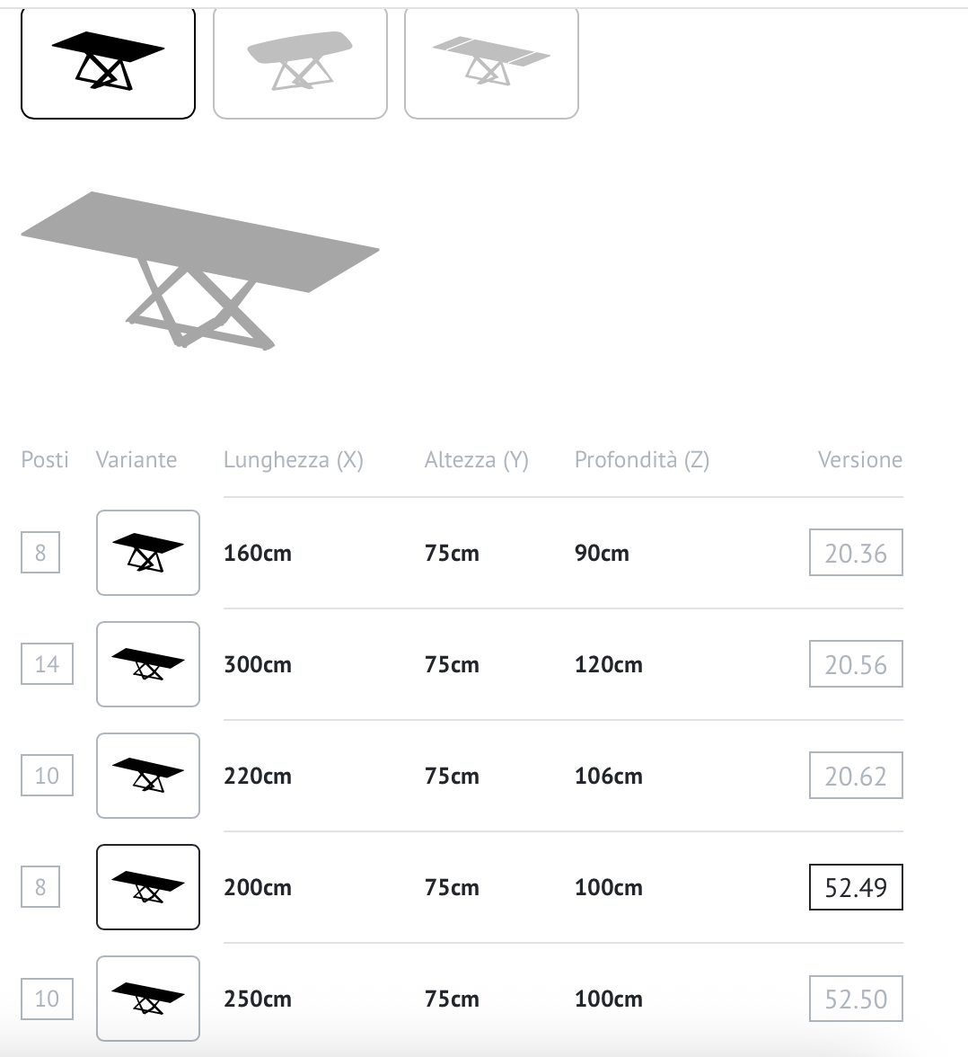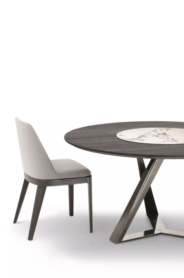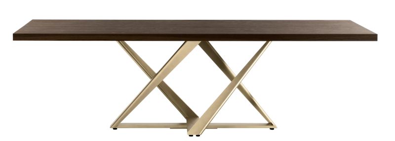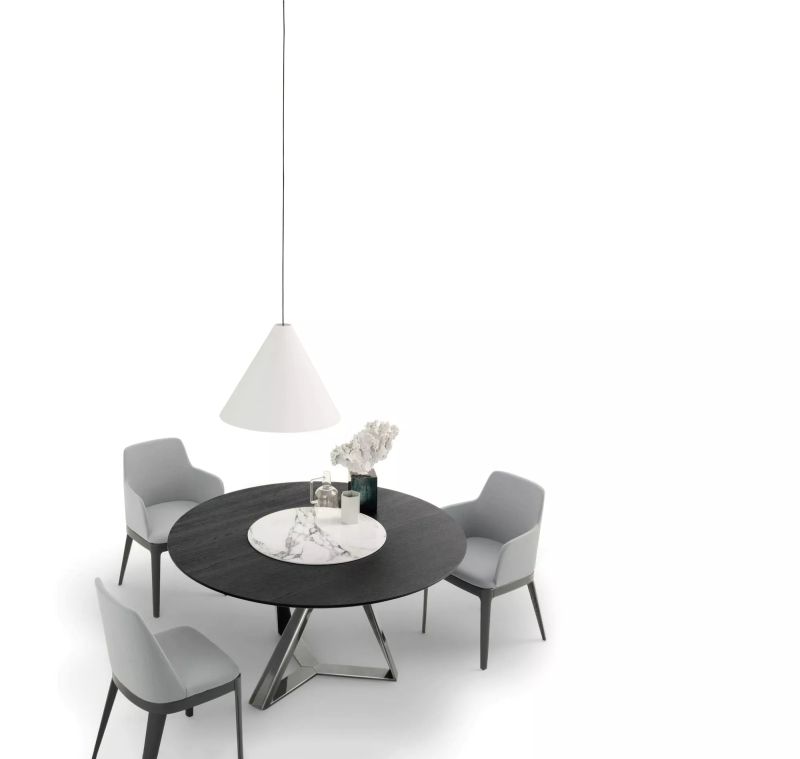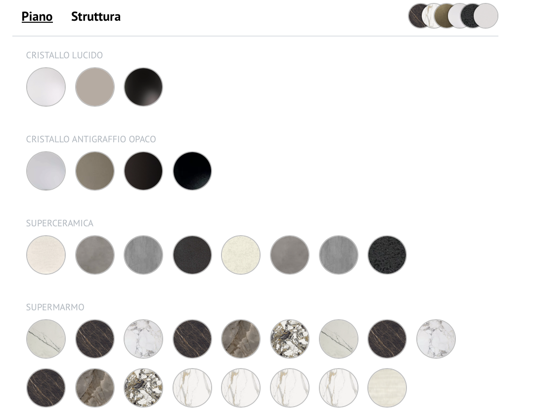 Кръгла или елипсовидна маса във фиксирана или разтегателна версия, с лакирана метална рамка. Плот от фурнировано дърво, гланцово стъкло, кадифено матово лакирано стъкло с устойчивост на надраскване или супермрамор и фиксирана кръгла маса с централен въртящ се плот от стъкло, стъкло с устойчивост на надраскване или супермрамор, пръстеновиден плот от фурнировано дърво.