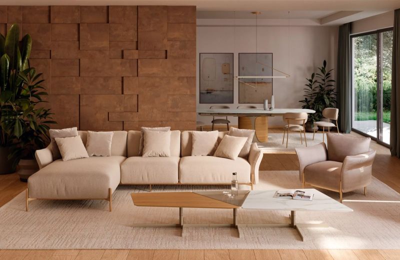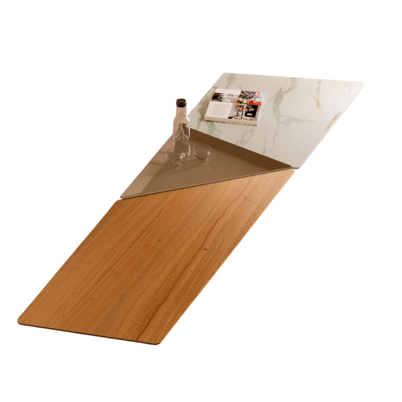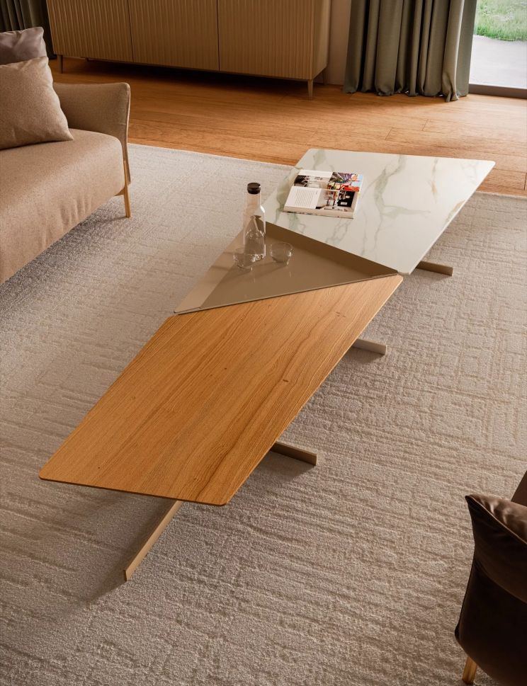 Bento не е просто странична маса, а система. Трилогия от елементи, проектирани да стоят самостоятелно или да се комбинират в допълващи се композиции. Три трапецовидни форми – различни, но хармонични – се вписват с естествена лекота. Истинската звезда е повърхността: всяка странична маса се предлага в различни покрития, които, когато са поставени една до друга, създават визуална текстура, която прелива през линиите, засилвайки композиционния ефект. Това е изискана игра на контраст и хармония, където материята става графична.