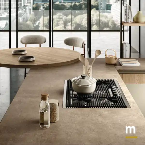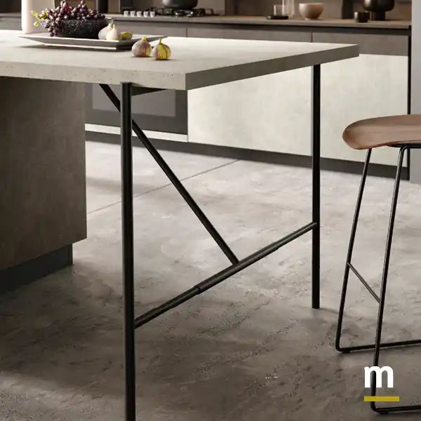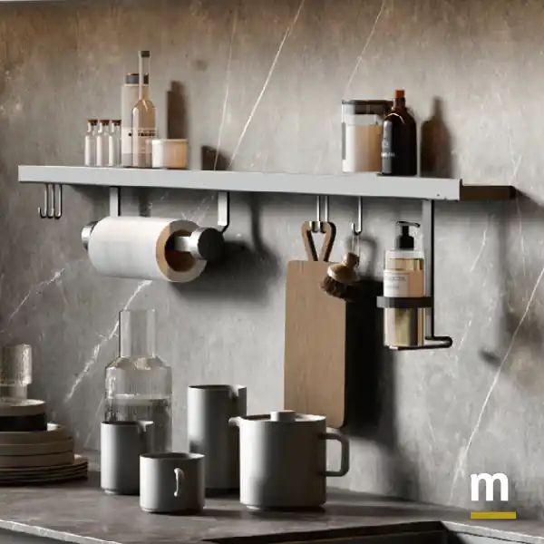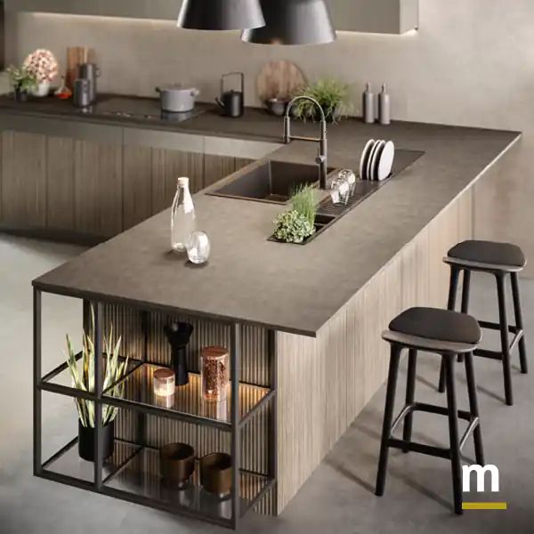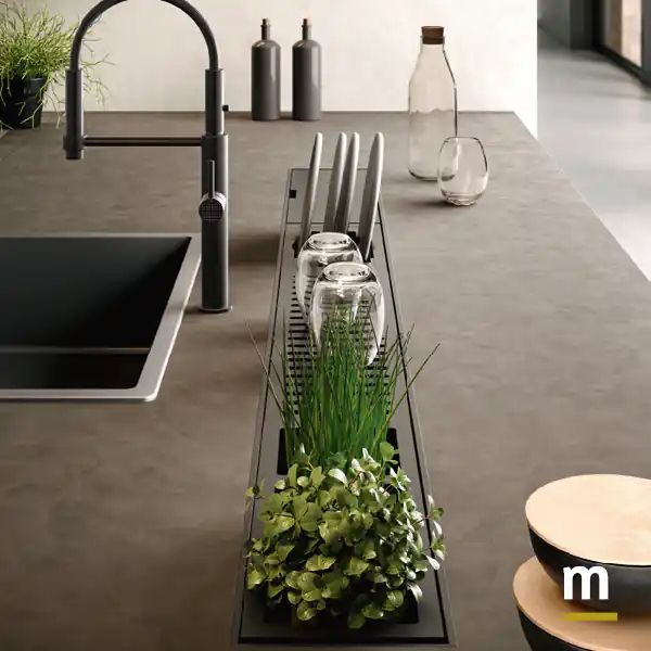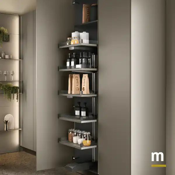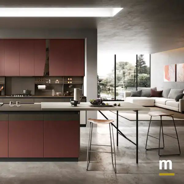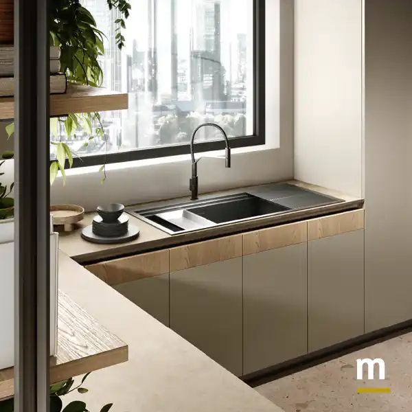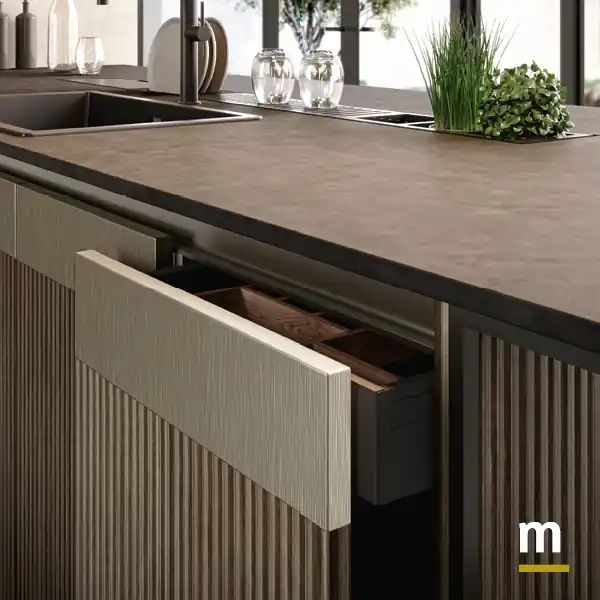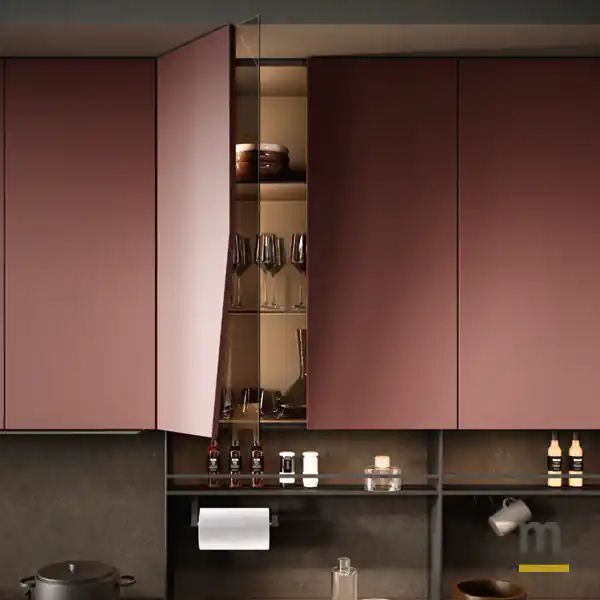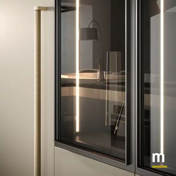 Елегантни линии, изчистени, функционални геометрии и стремеж към максимална композиционна свобода. Друга отличителна черта е елегантната вертикална дръжка, избрана за високите шкафове, която придава усещане за стройност и солидност.