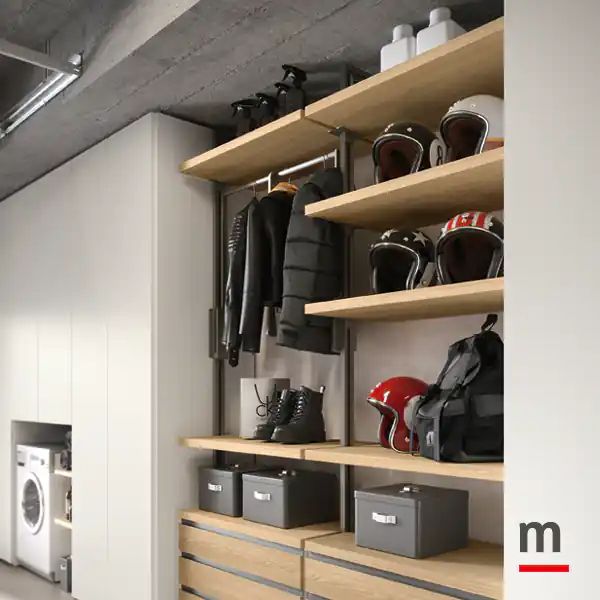 Стена, организирана с обикновен гардероб с панти и модул за пране, допълнен от практичен гардероб с рафтове и чекмеджета. Система, която се вписва във всяко пространство, подходяща за съхранение не само на дрехи, но и на предмети и оборудване.