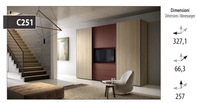 Гардероб с две плъзгащи се врати Bora, централен корпус с фронтове Libeccio и въртящо се отделение за телевизор. Всичко в един гардероб. Комбинираните гардероби ви позволяват да комбинирате различни системи. Плъзгащите се и шарнирните врати се сливат безпроблемно и уникално.