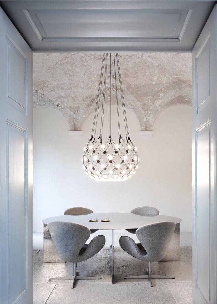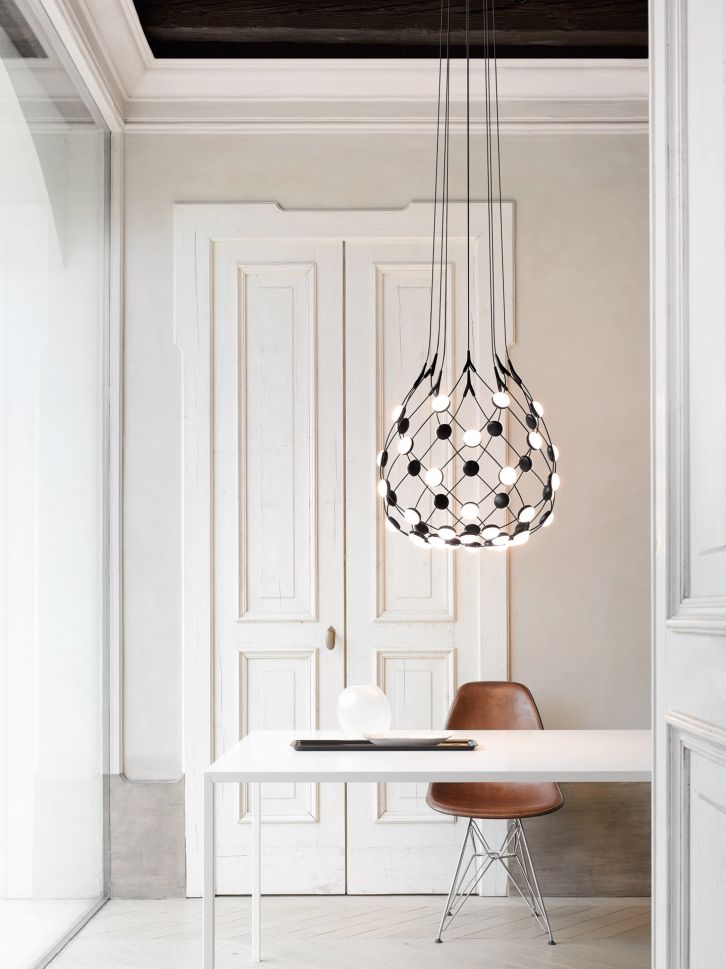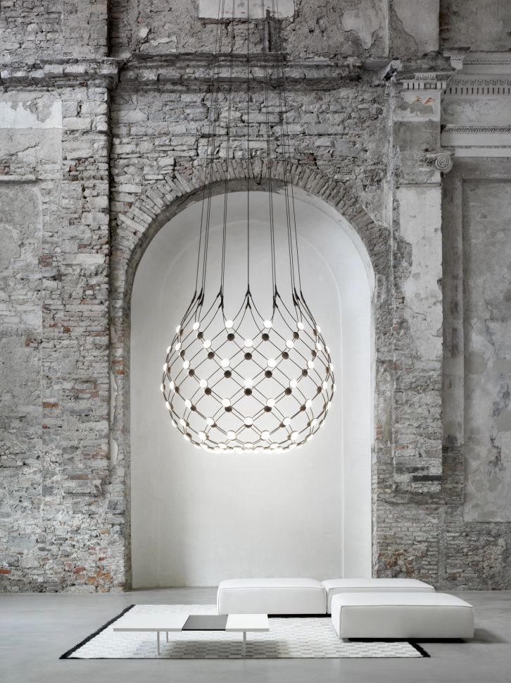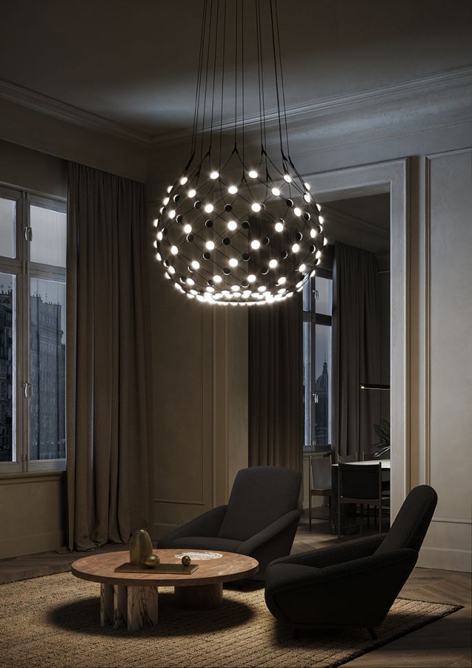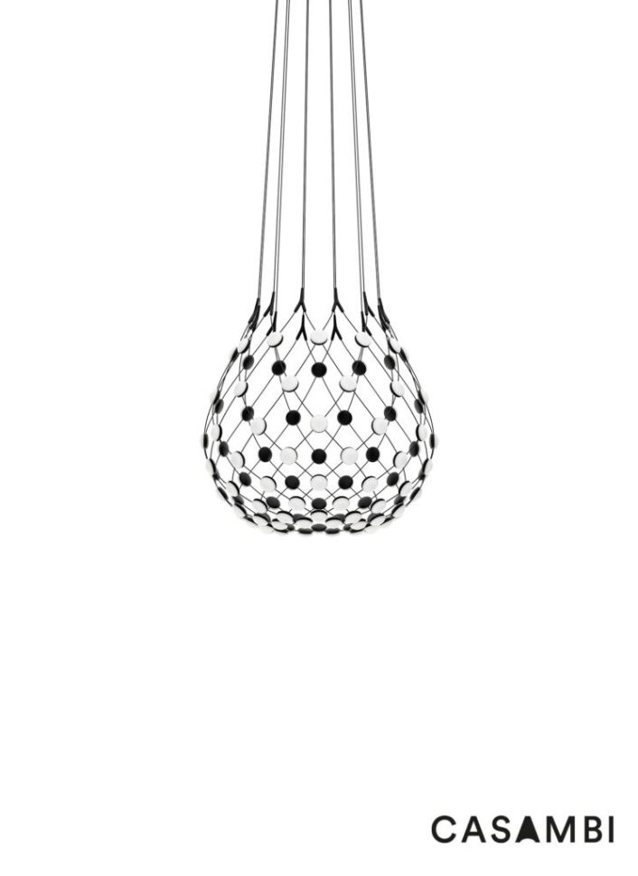 Лампа с голямо театрално въздействие, чиято почти прозрачна структура, съставена от мрежа от гъвкави кабели с LED източници, разположени на пресечните им точки, прикрива сложността на дизайна, дематериализирайки го, за да освободи място само за светлината, истинския протагонист.