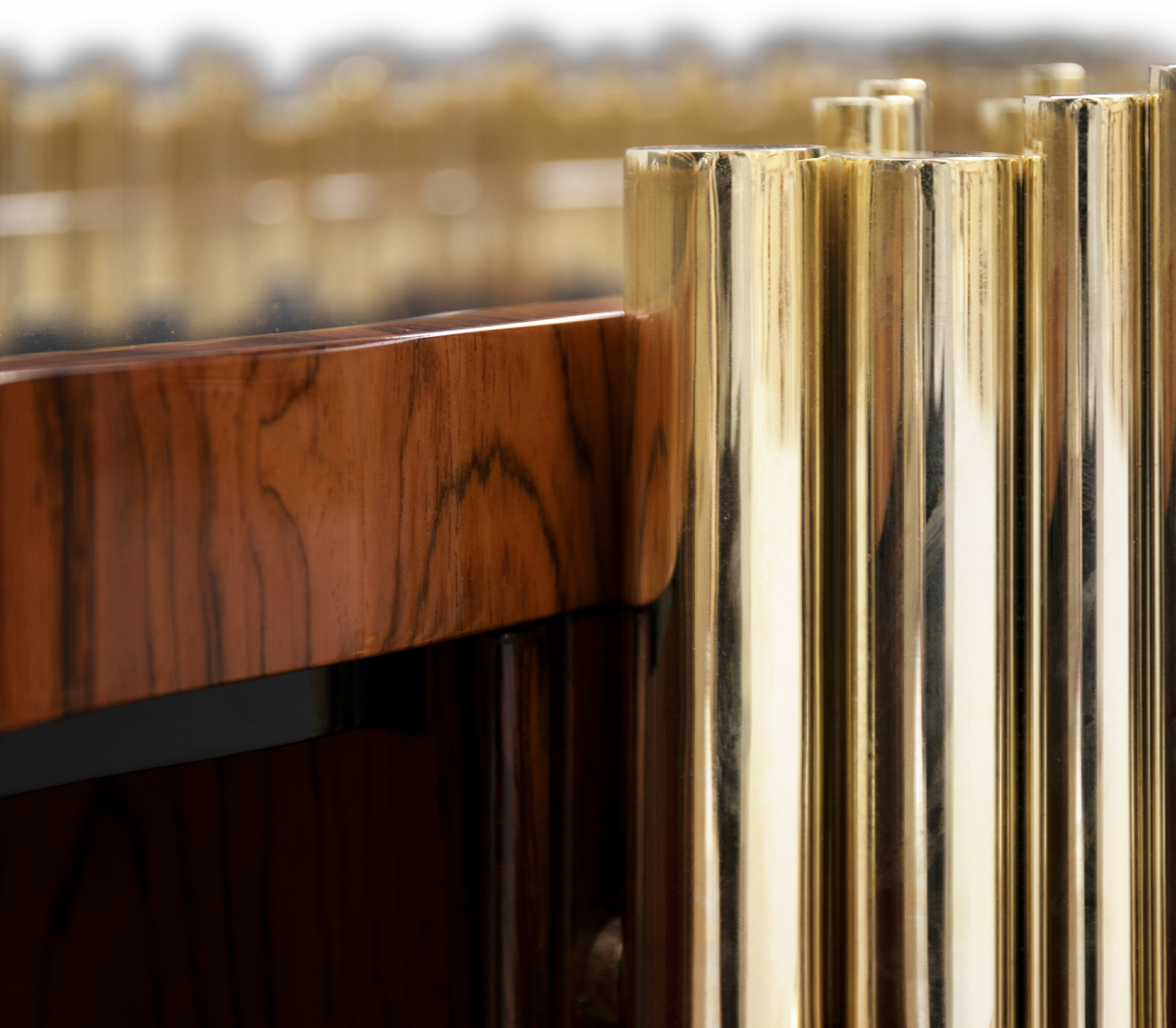 Дървена конструкция с огледална повърхност с две полирани плочи от неръждаема стомана, разкъсани от изкован полиран месингов лист. Лампа от лят месинг. Електрификацията е вградена в кутия, фиксирана на гърба на дървената конструкция.