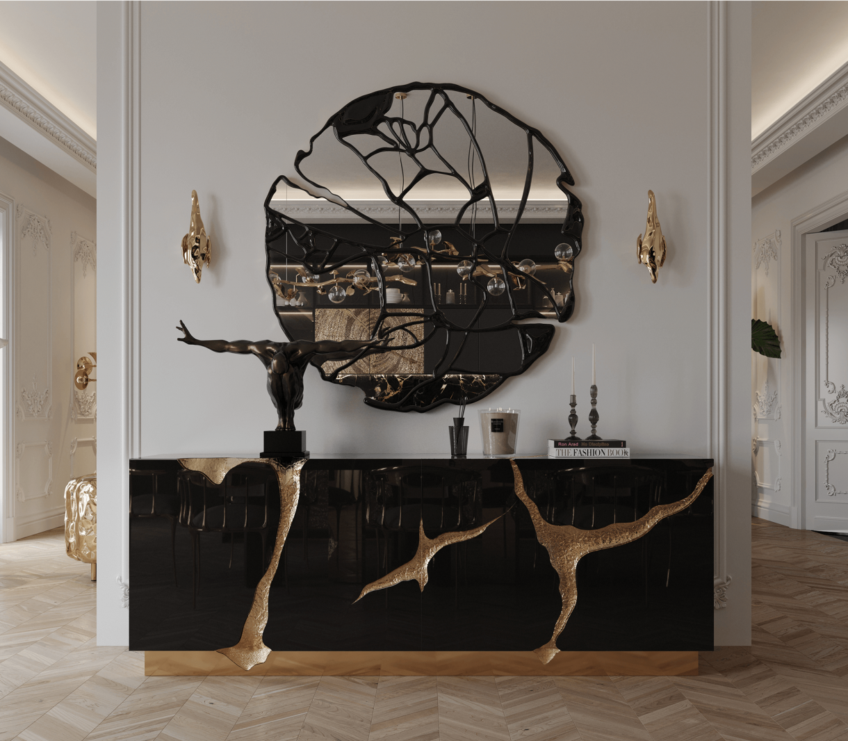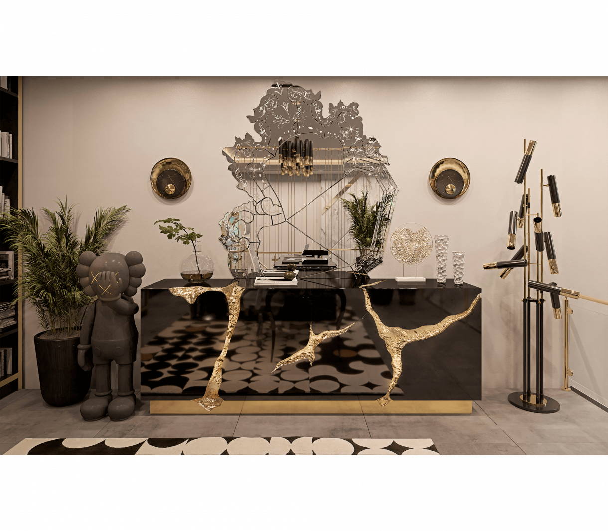 ХАРАКТЕРИСТИКИ НА ПРОДУКТА Полирана неръждаема стомана с екстериори от лят месинг. Дървена структура. Интериор: дървен фурнир, полиран месинг, стъкло (4 врати и 1 чекмедже). Основа: полиран месинг