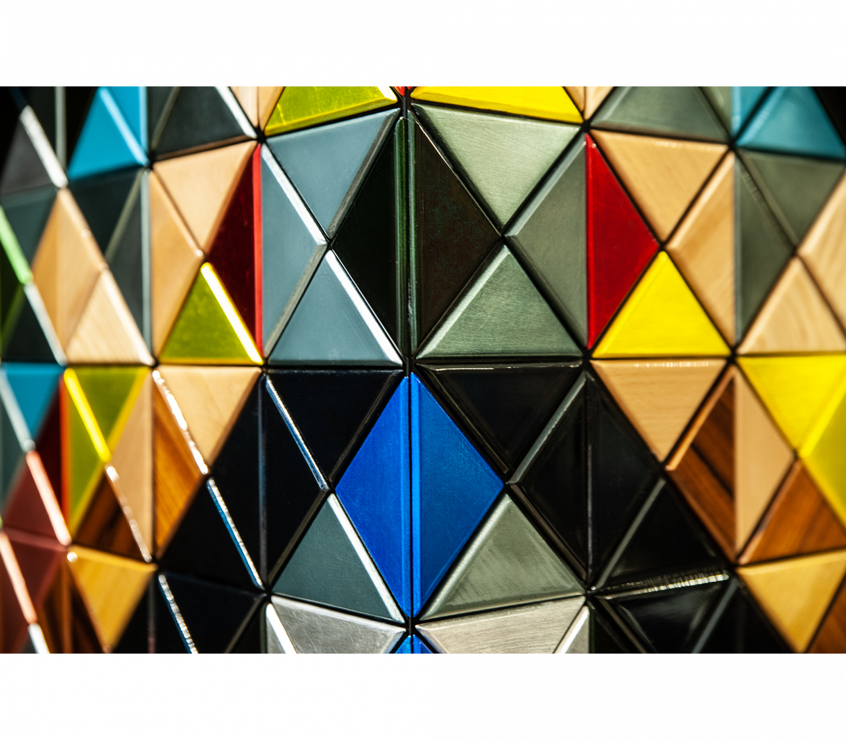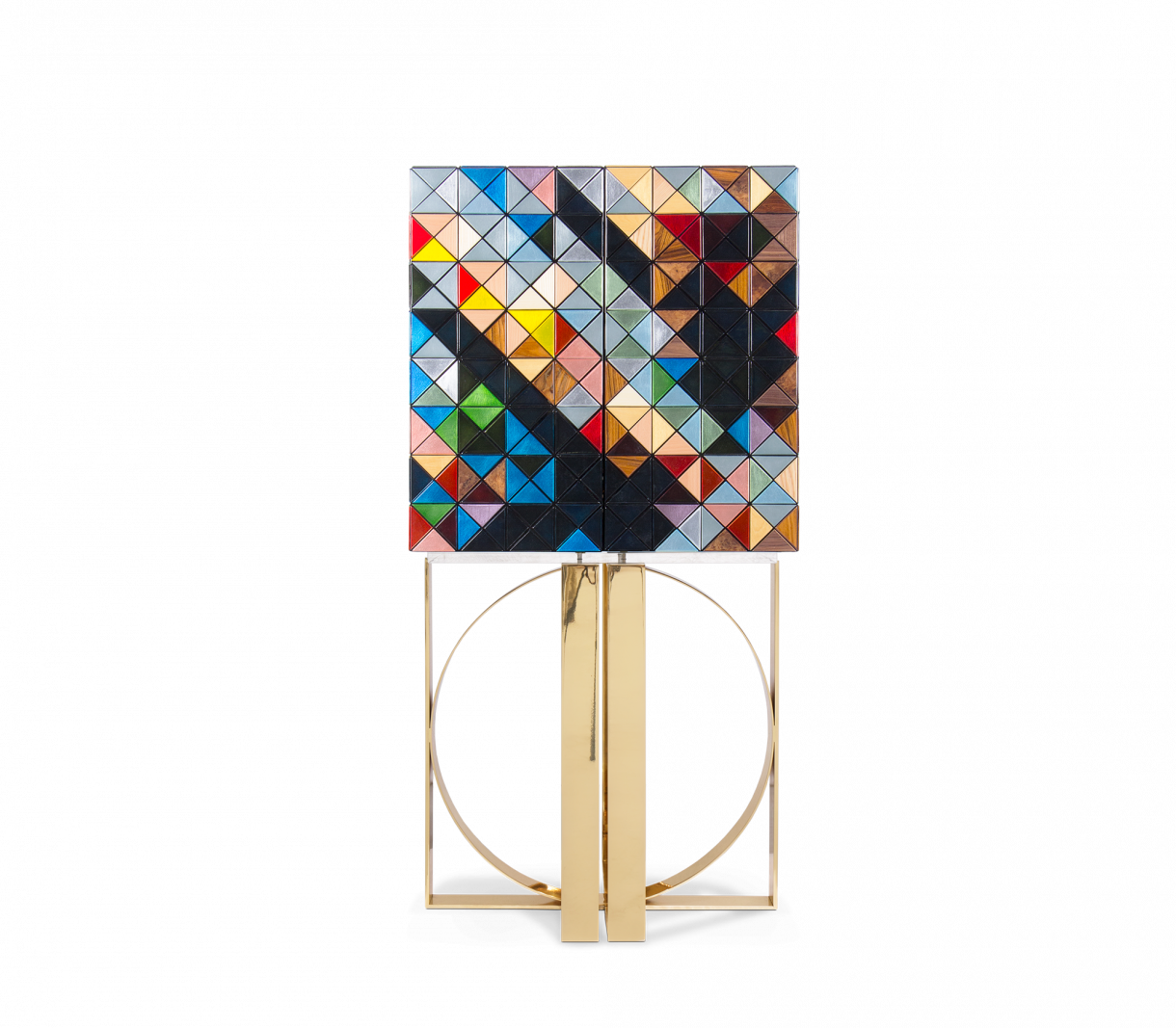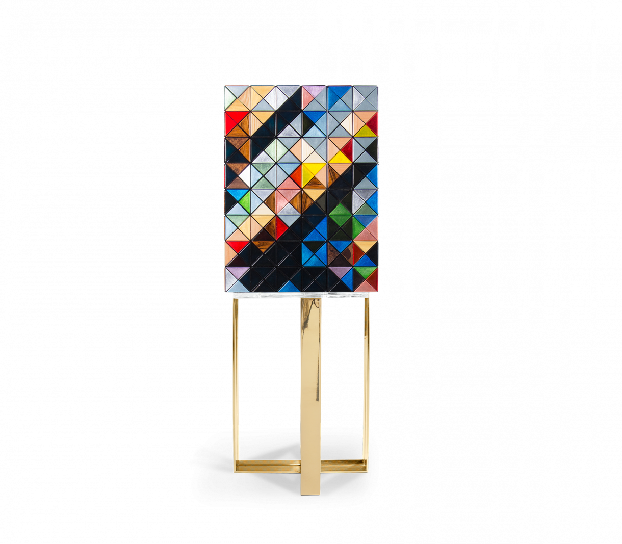 Съвременен бар шкаф, изработен от 1088 дървени триъгълника в разнообразие от дърво и покрития: ръчно изработени позлатени триъгълници от листа, 10 различни вида дървени листа от палисандър до фурнир от африкански орех и лакиране. Зад двете му врати, вечна комбинация от състарено огледало, покриващо отворено пространство, съдържащо девет вътрешни чекмеджета, всяко със златно изящно копче. Вратите са тапицирани с диамантено ватирана синя копринена дамаска. Полираната месингова основа придава на Pixel уникален и изтънчен характер.