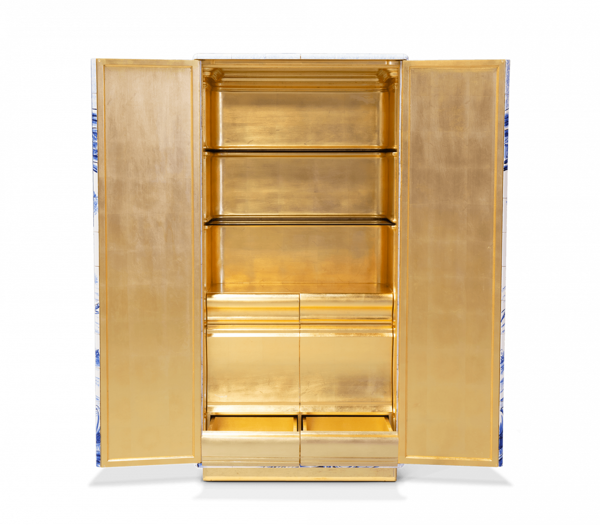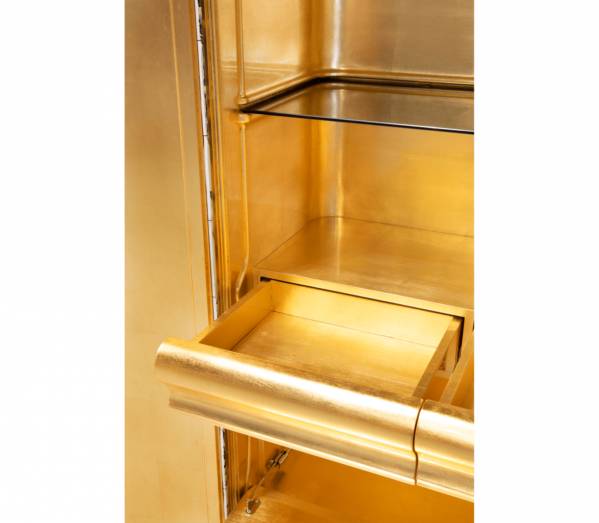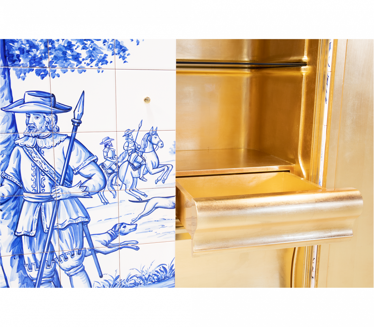 Шкаф, облицован с ръчно рисувани плочки. Във вътрешността му има една врата и четири чекмеджета изцяло облицовани със златни листа. Съдържа два рафта, изработени от бронзово стъкло. Основата е изработена от ръчно изкован месинг.