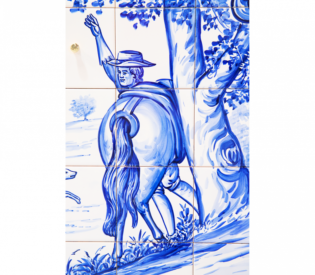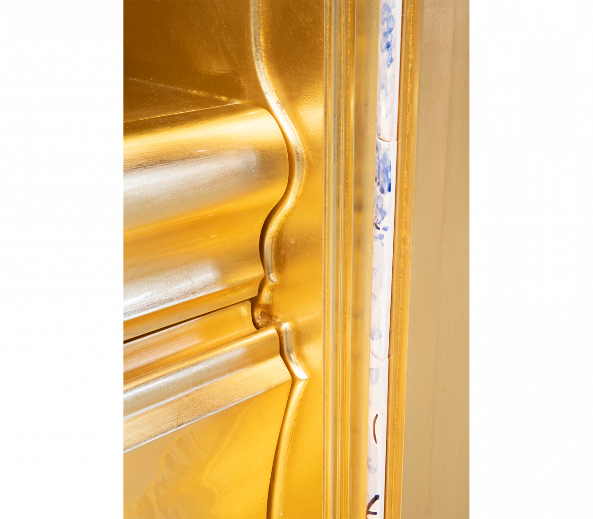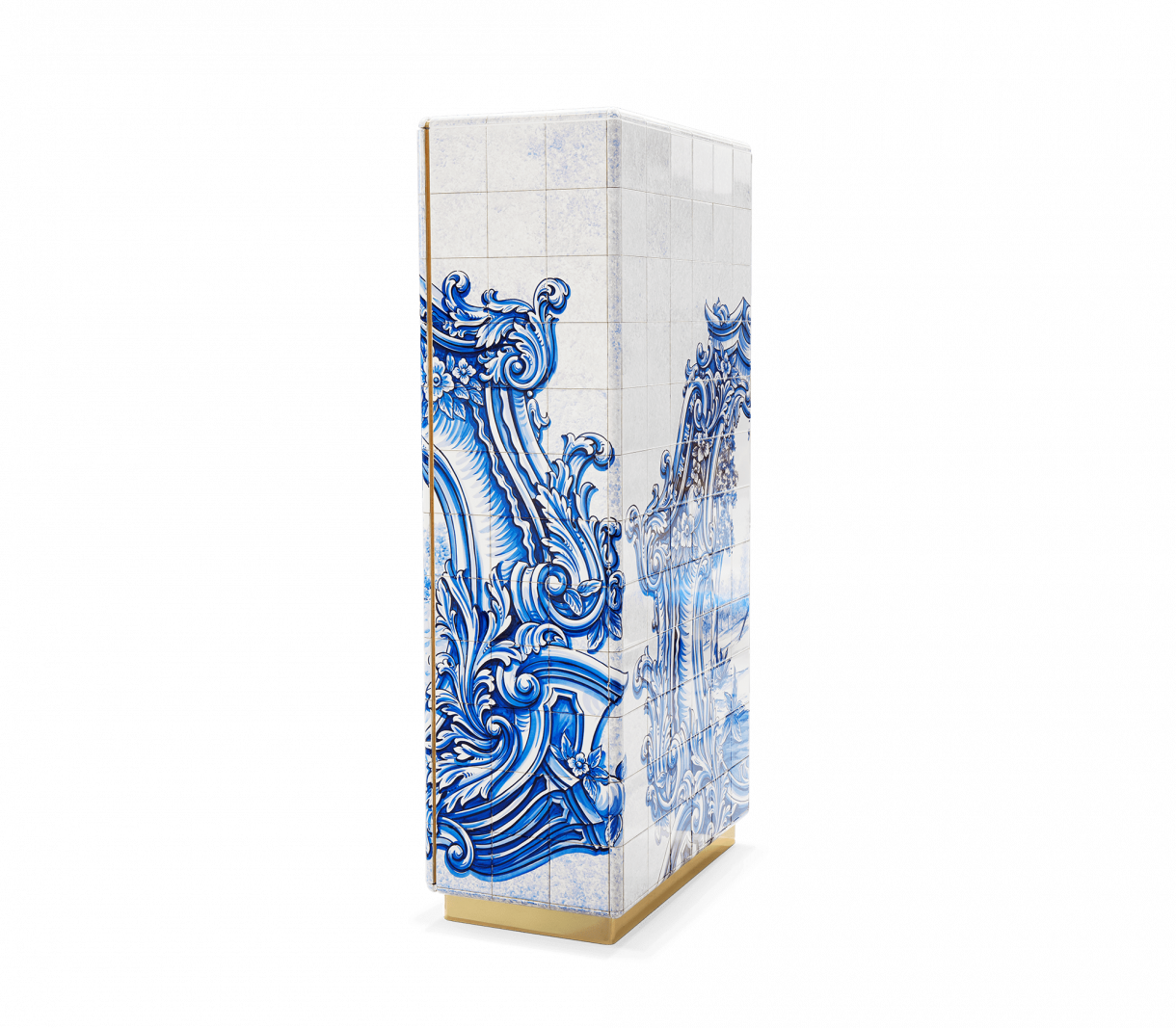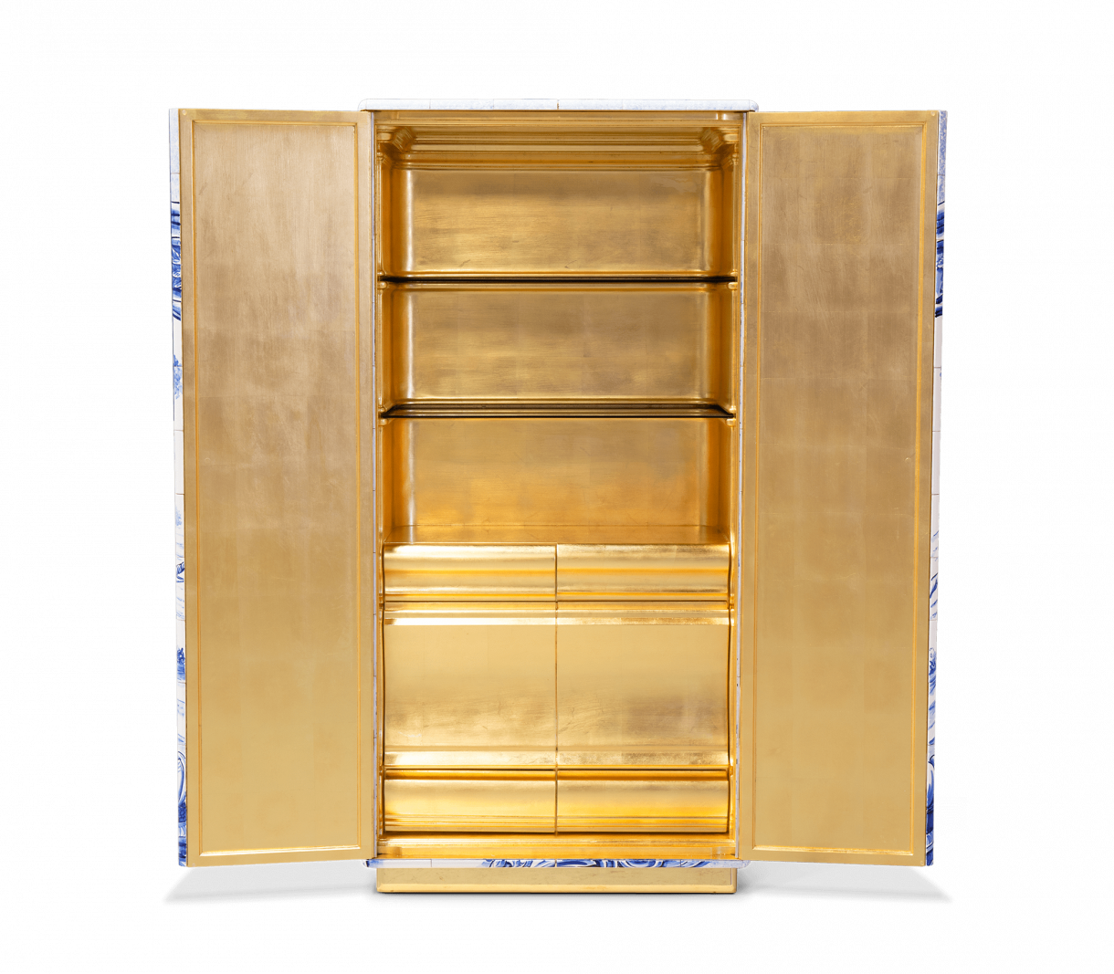 Шкаф, облицован с ръчно рисувани плочки. Във вътрешността му има една врата и четири чекмеджета изцяло облицовани със златни листа. Съдържа два рафта, изработени от бронзово стъкло. Основата е изработена от ръчно изкован месинг.
