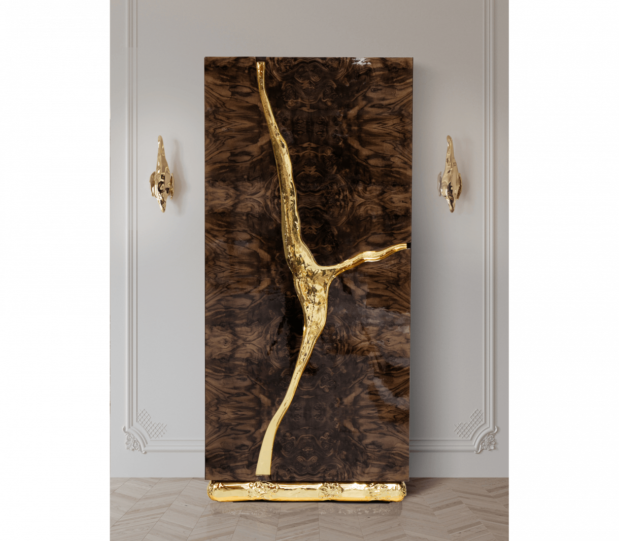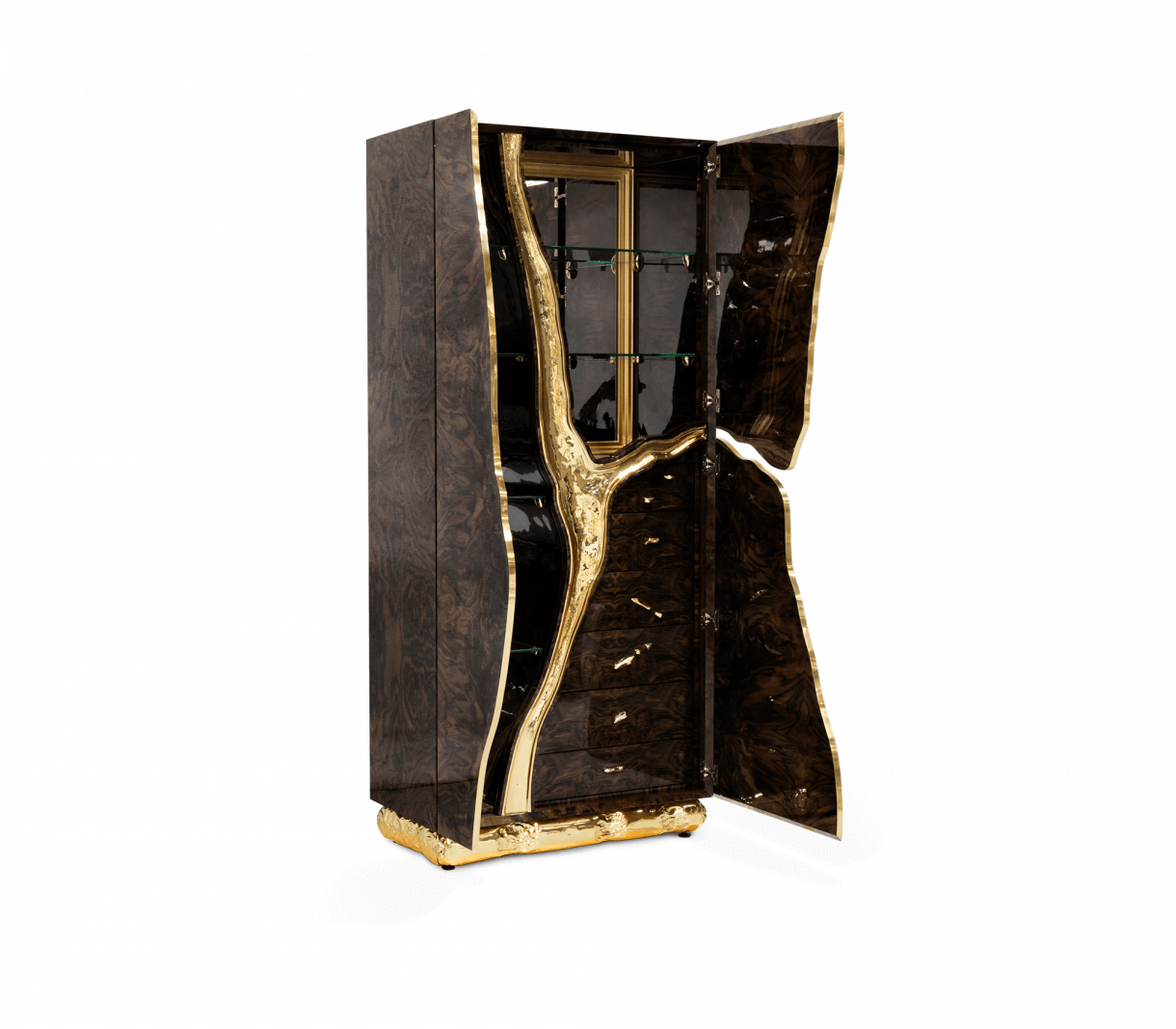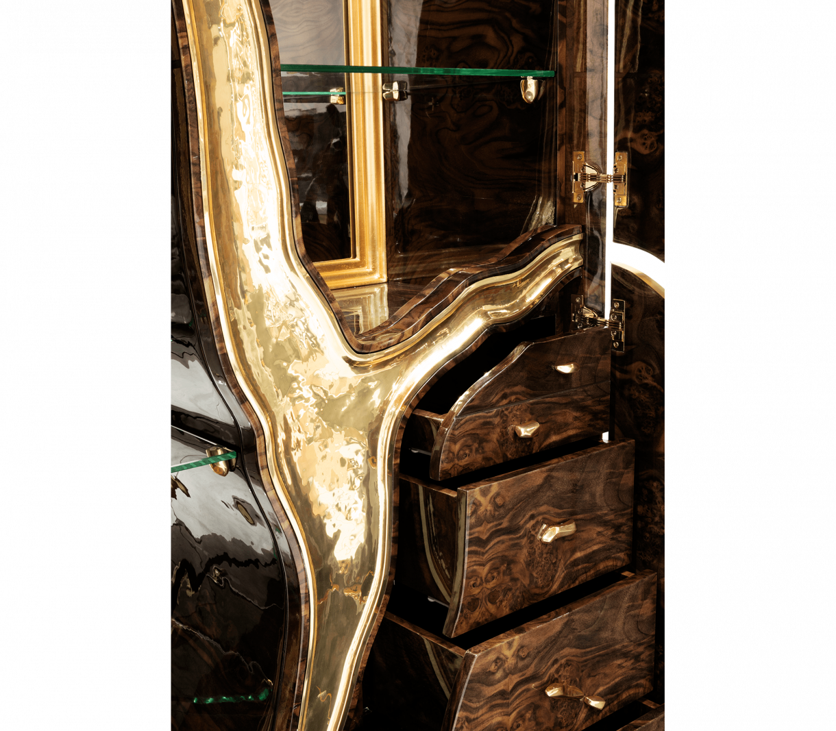Външно покритие с фурнир от орехов корен и златни покрития от кован полиран месинг. Интериор от тополов корен и полиран месинг. Разполага с 3 врати, 6 чекмеджета, 6 стъклени рафта.