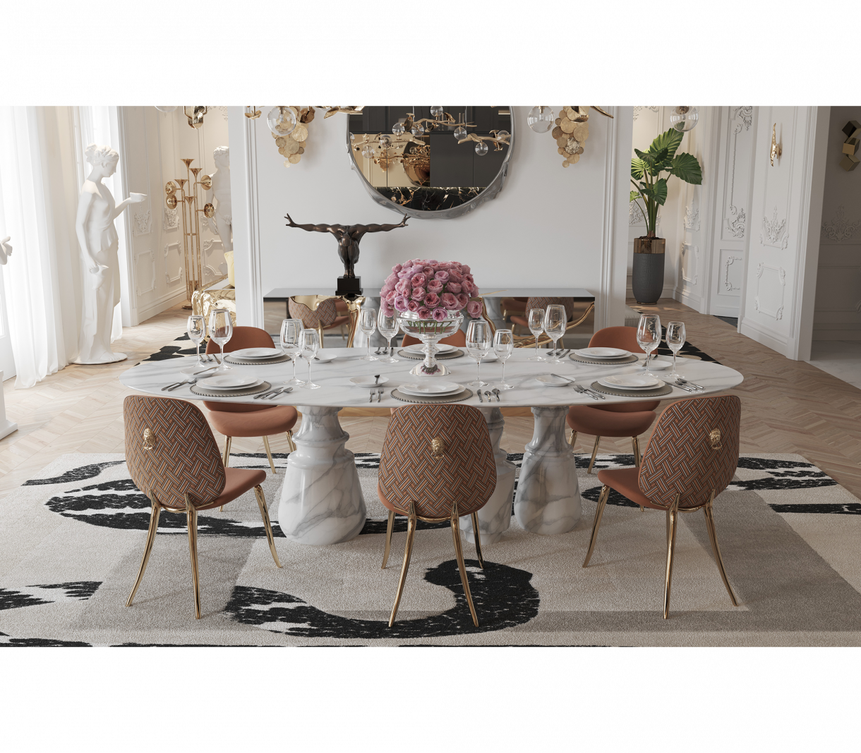 Овална маса от бял мрамор Estremoz. Три основи от обърнат мрамор.