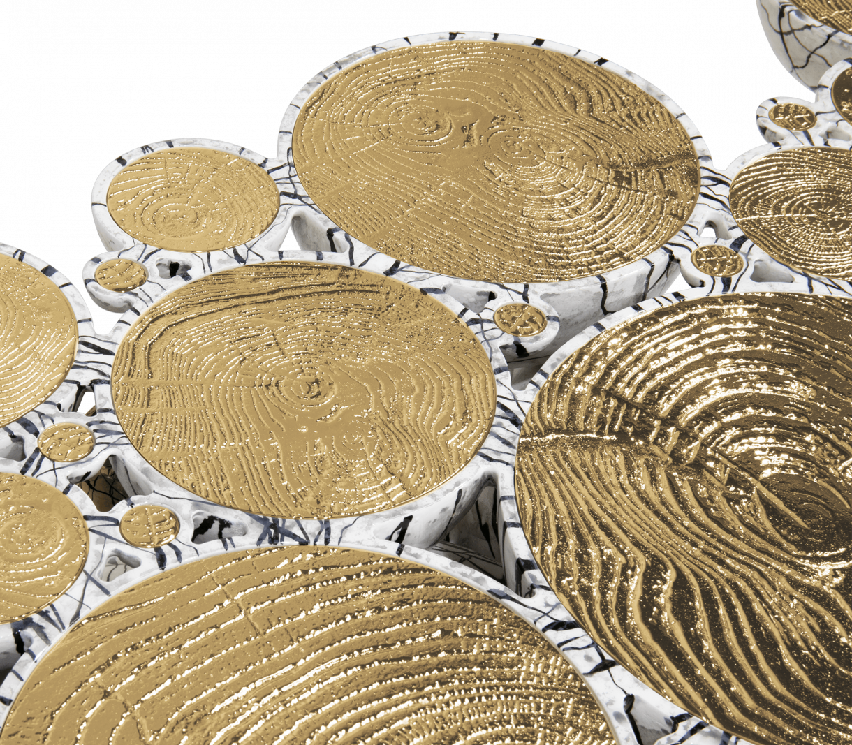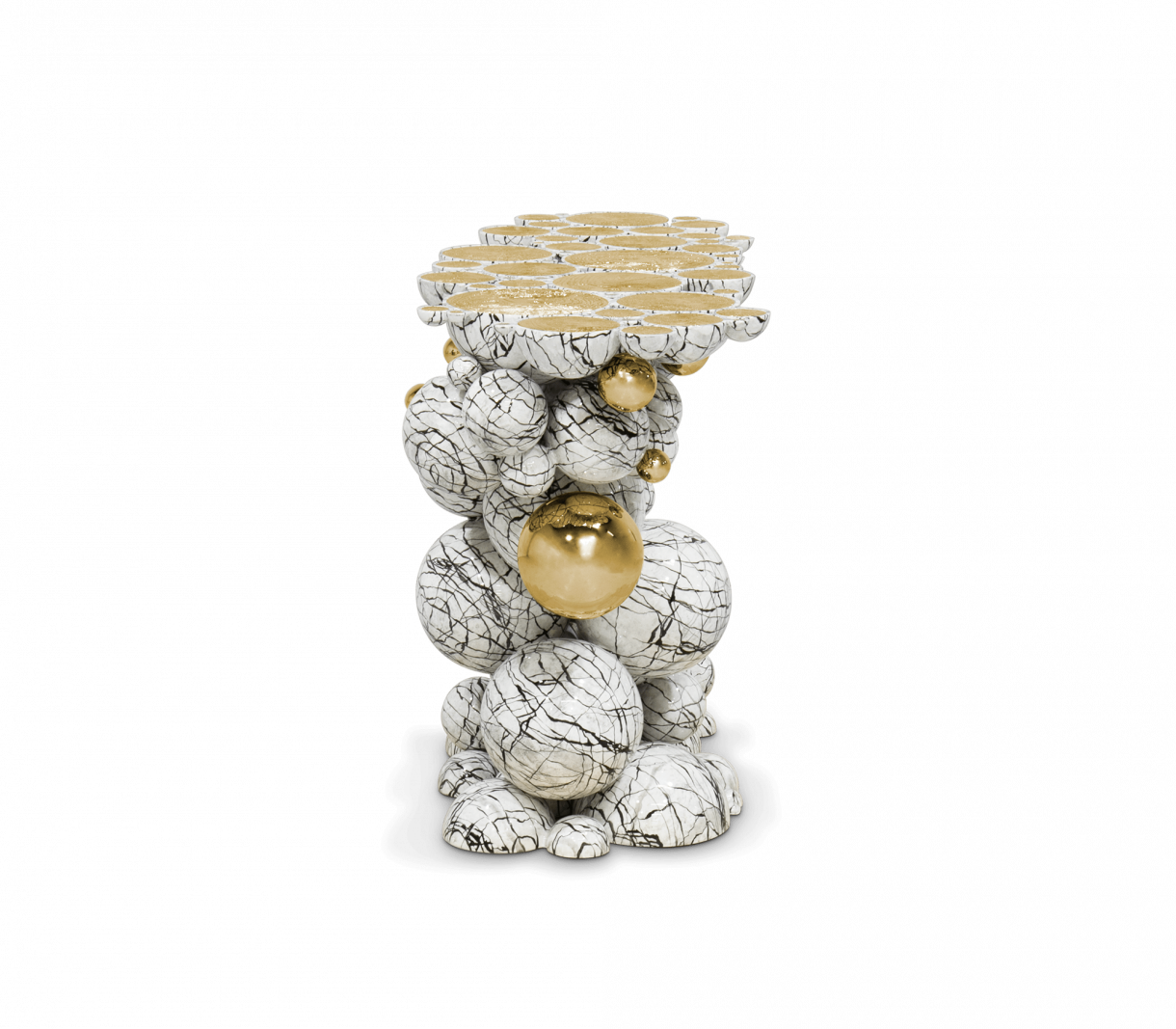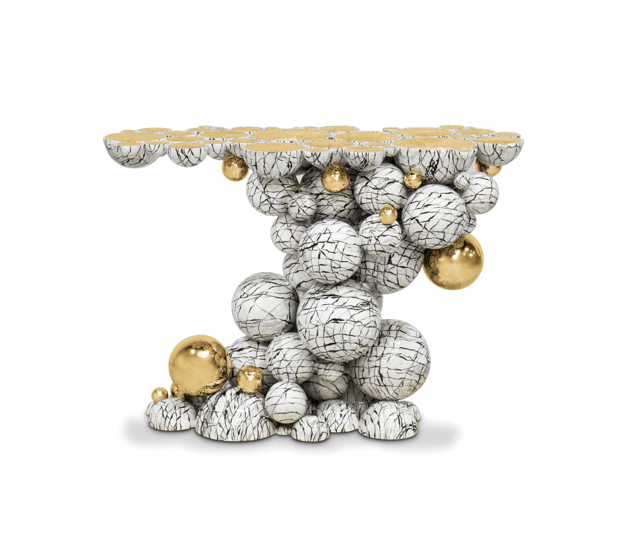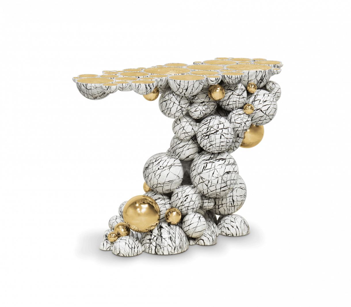 Противопоставяйки се на законите на физиката, черно-златната конзола Newton е израснала от древното изкуство за леене на метал, където металът се нагрява, докато се разтопи във формата на сфери и полусфери. Един по един, всеки елемент е съединен, за да се получи изключителен модел и органична структура, завършени в драматичен черен лак и позлатени акценти. Плотът на тази конзолна маса е съставен от месингови кръгове, издълбани със златиста текстура, подобна на органична дървесна текстура. Съвременна конзола, която носи културно наследство, докато успешно върви към бъдещето, оставайки пред дизайнерската сцена. Истински израз на изключителност и високо колекционерско майсторство.
