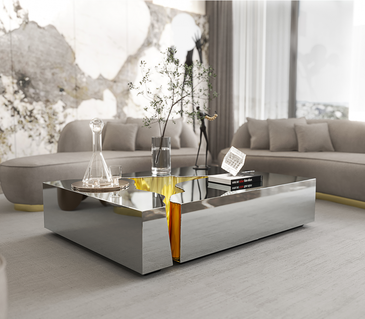 Полирана неръждаема стомана, полиран месинг, структура дърво.