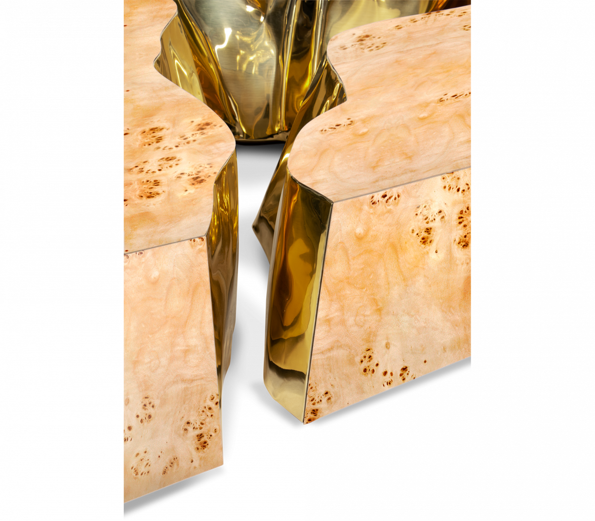 Полирана неръждаема стомана, полиран месинг, структура дърво.