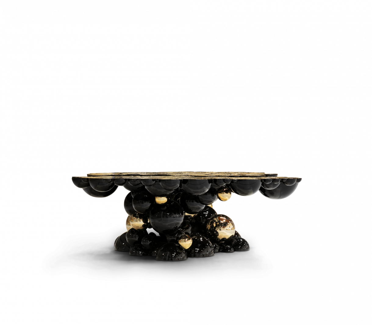 Овална централна маса, изградена от алуминиеви сфери, съединени за създаване на модел и структура, завършена в черен лак и позлатено покритие. Повърхностната му текстура, проектирана да наподобява рязано дърво, е позлатена.