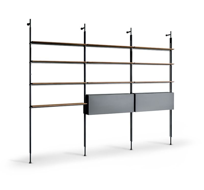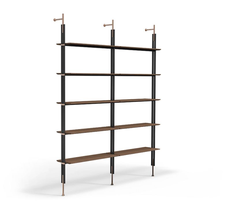 Възможността за фиксиране на модерната модулна библиотека Roll към тавана, както и към стената, я прави елемент за обзавеждане, който може да се монтира и в центъра на стаята, за да я раздели на две пространства. Монтирането му към стената става посредством опори, съставени от метални тръби с оловно покритие; както рафтовете, така и детайлите, които излизат от металните тръби, се предлагат в същото покритие като опорите или в различни покрития за игра на контрасти на изключителна елегантност. Модулността на модерната библиотека Roll я прави подходяща за всеки размер стена, както в дома, така и в офиса. Наличен е и модул кутия за съхранение на предмети и книги.