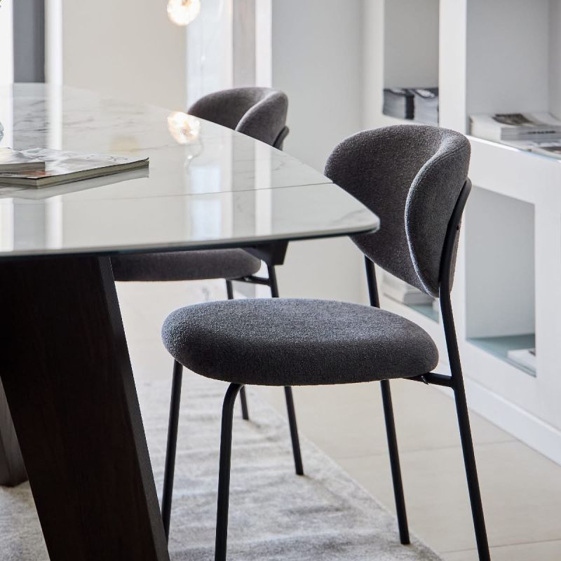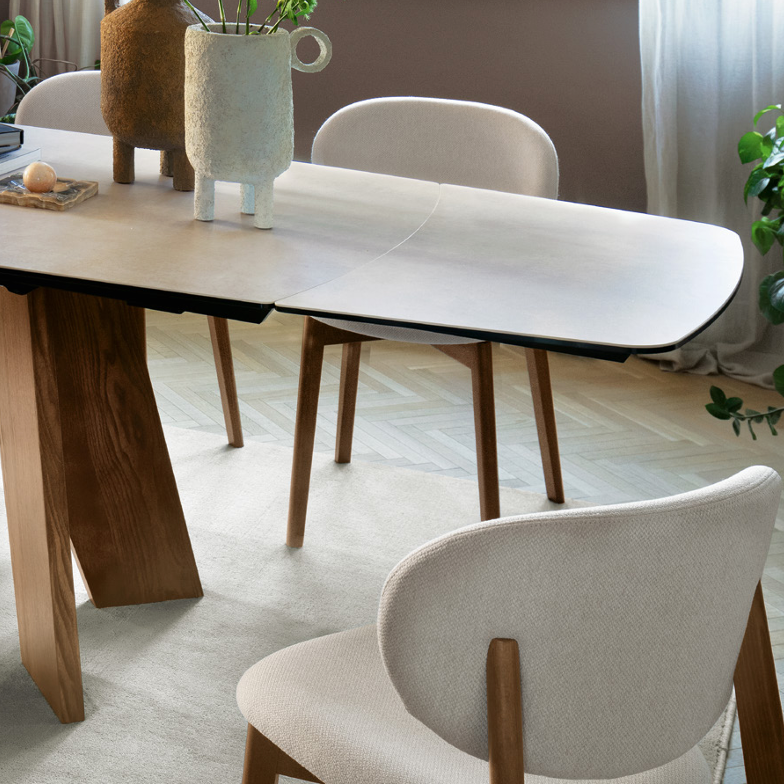 Масата Victor се отличава с основата си, характеризираща се с две оцветени опори от ясеново дърво, които създават отличителен графичен знак и придават динамика и визуална инерция на целия дизайн. Изисканият и издръжлив керамичен плот се интегрира хармонично с основата, засилвайки контраста между материалите. Балансът между здравина и лекота прави тази маса елемент с голямо естетическо въздействие, способен да обогати всяка среда със своята елегантност.