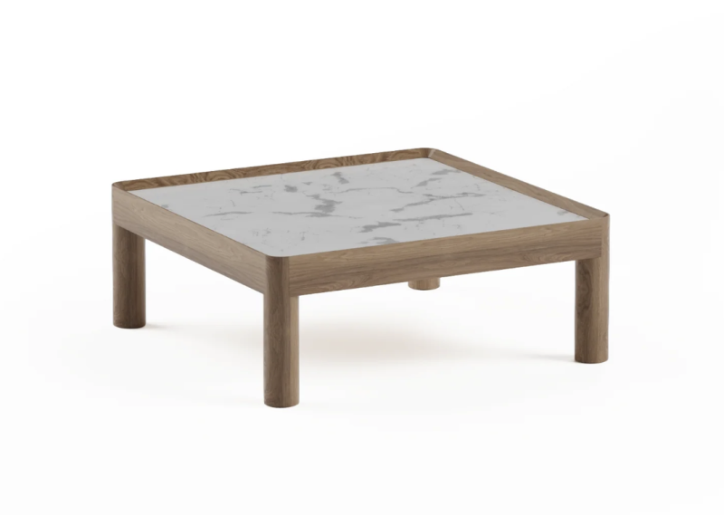 INSET се определя от масивна дъбова рамка, която придава на изделието структура и присъствие. В нея плотът е поставен като вложка, прецизно паснала и умишлено контрастираща с топлината на дървото. В зависимост от материала, характерът на масата се променя от мек и естествен с фурнирована повърхност до по-тактилен и дефиниран, когато е завършена с камък. Композицията остава ясна и балансирана, изградена върху пропорции, материал и сдържаност.