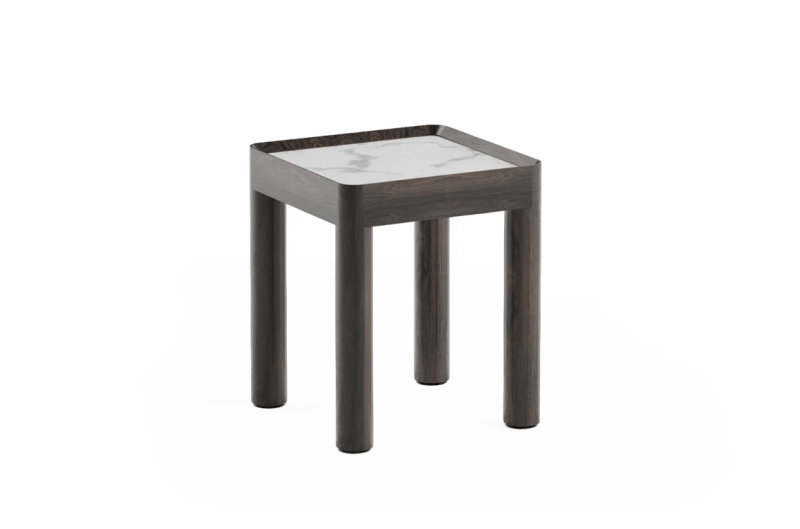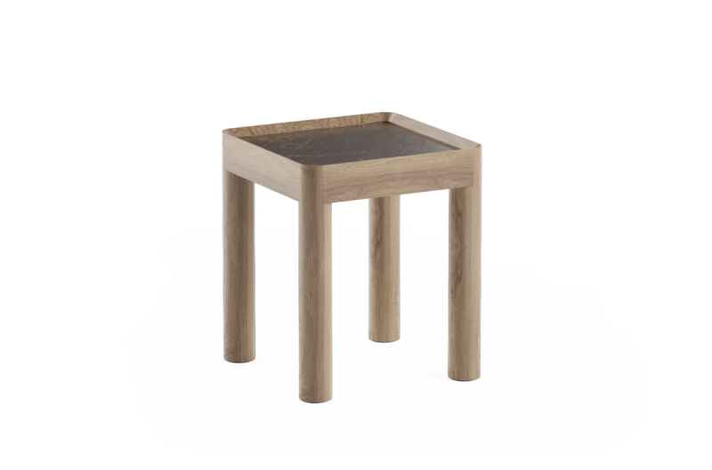 INSET се определя от масивна дъбова рамка, която придава на изделието структура и присъствие. В нея плотът е поставен като вложка, прецизно паснала и умишлено контрастираща с топлината на дървото. В зависимост от материала, характерът на масата се променя от мек и естествен с фурнирована повърхност до по-тактилен и дефиниран, когато е завършена с камък. Композицията остава ясна и балансирана, изградена върху пропорции, материал и сдържаност.