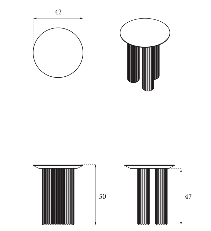 Плотът на масата е с леко заоблен ръб, който изглежда визуално по-тънък, отколкото е в действителност - ефект, постигнат чрез ъглово фрезоване от долната страна. Този дизайнерски детайл фино подчертава скулптурната елегантност на набраздените крака. Оребреният мотив напомня формата на класическа архитектурна колона, препращайки към древната роля на стълбовете като структурни и символични елементи.