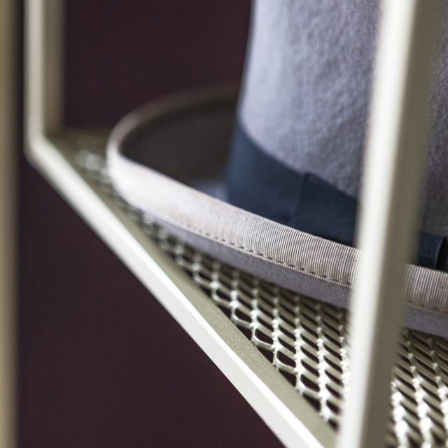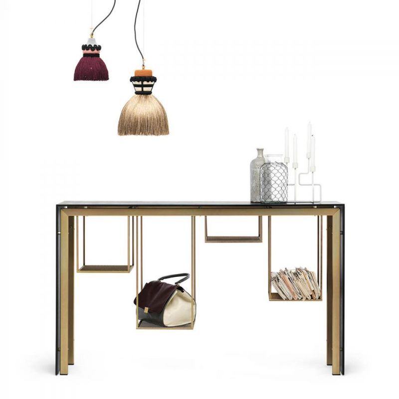 Токио е конзола, а също и пейка. Метална конструкция и рафтове от разширен метал, боядисани в матово златисто, плот и страни в черно Valcromat. Практичен елемент, оборудван с използваеми опорни повърхности, окачени под плота, минималистичен и строг.