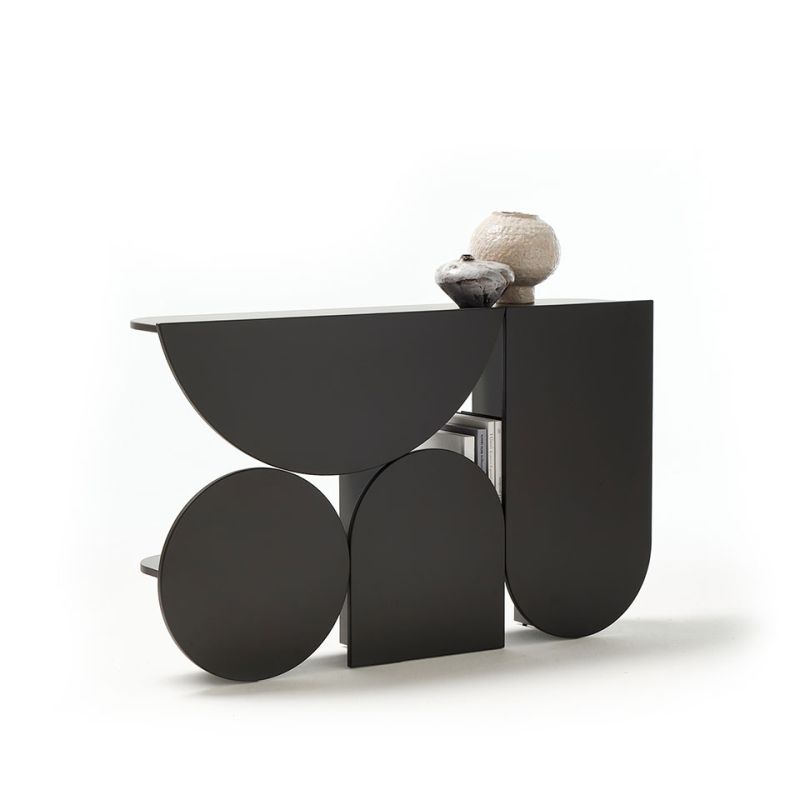 Конзола от MDF с матово или гланцово лакирано покритие и ръчно шпаклован материал в цветовете по мостра. Естетически баланс между крака и плот, за да обзаведе със силна индивидуалност различни зони на дома, от входа до пространството за преминаване от хола до зоната за спане.