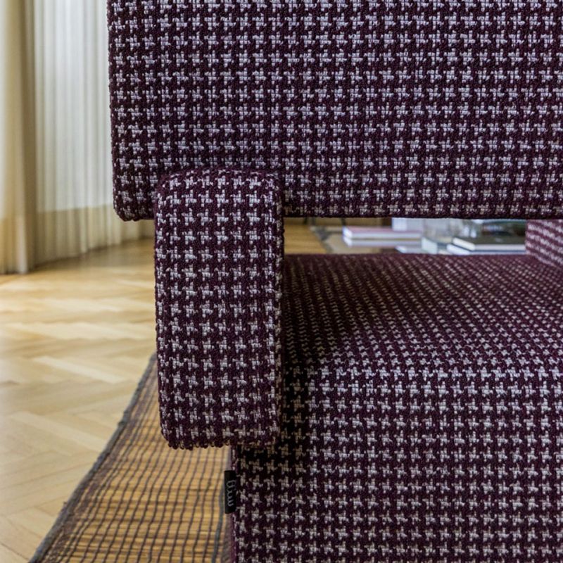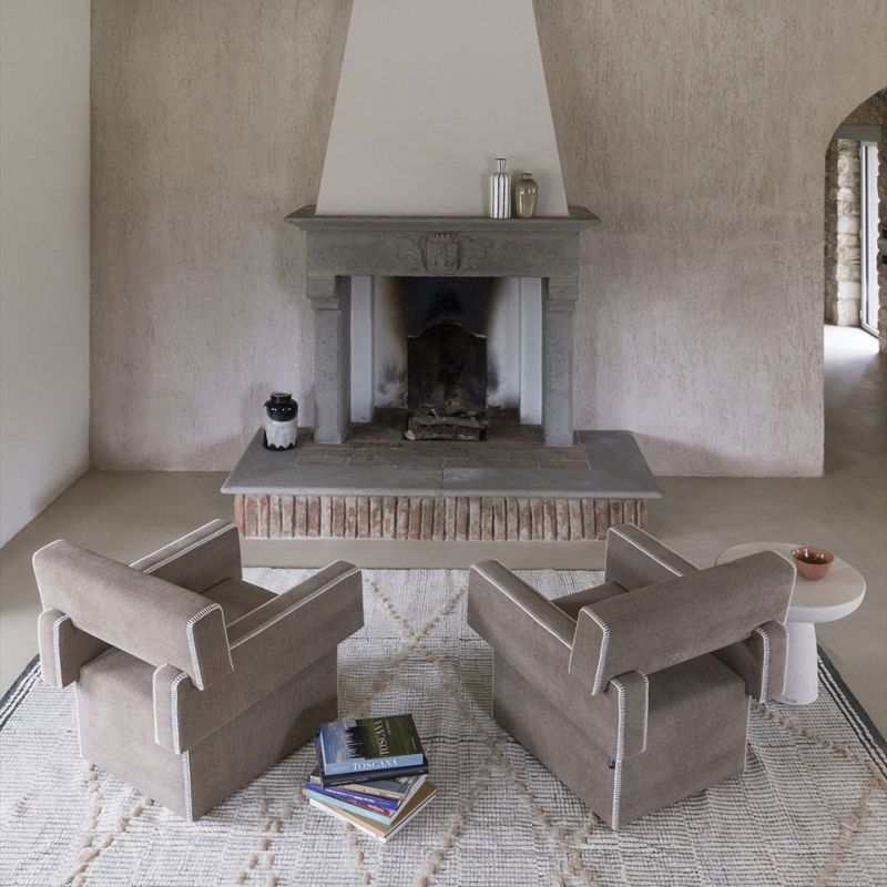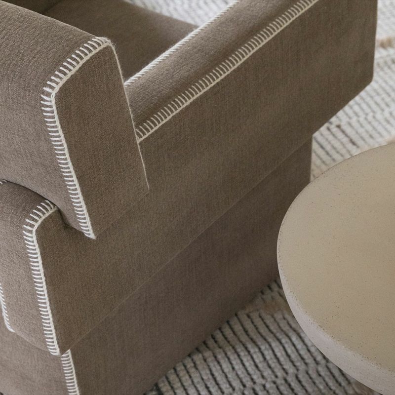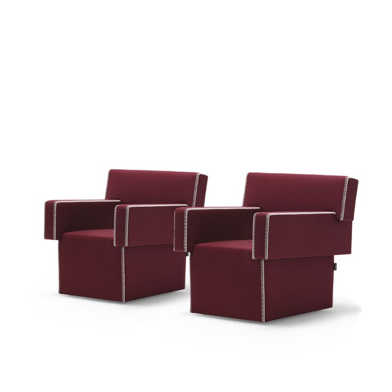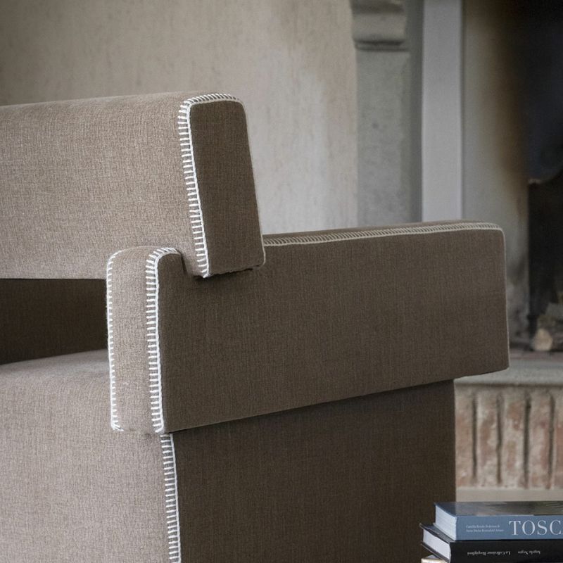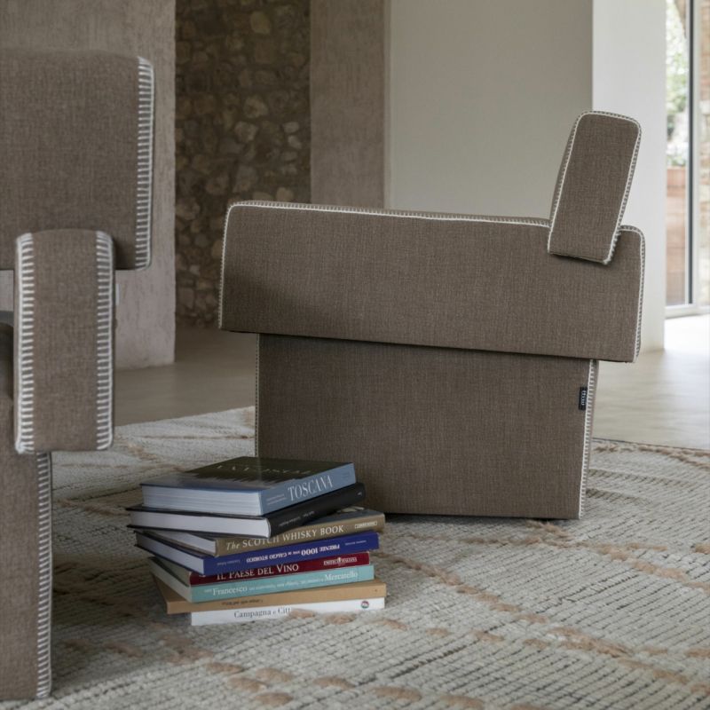 Тапициран фотьойл с несвалящ се калъф, многофункционален и вечен, съставен от семпли и основни обеми със строги пропорции. По заявка с шевове „пунто кавало“.