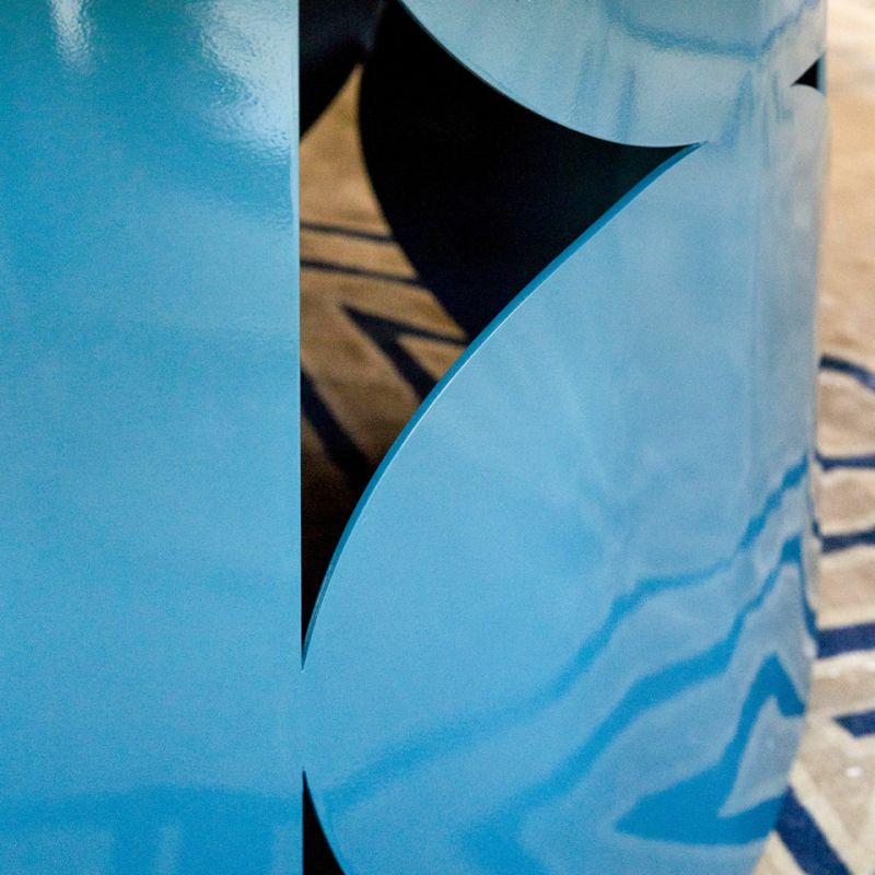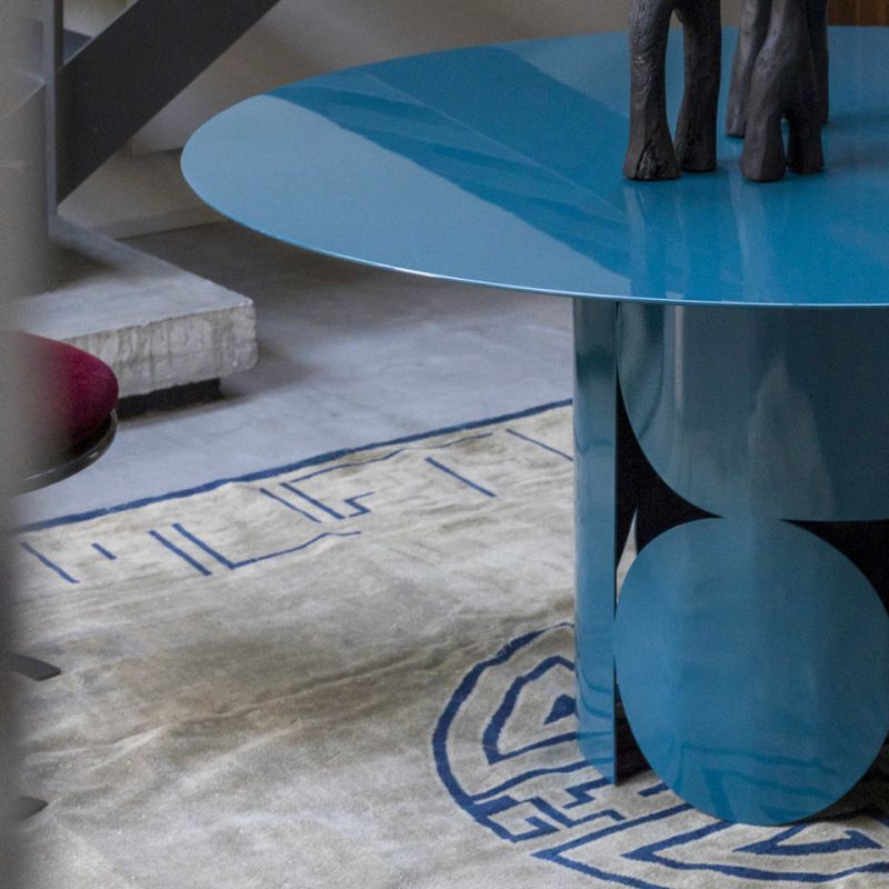 Маса с перфорирана метална основа и дървен плот. Предлага се в следните варианти: матов или гланцов лак във всички цветове по мостри или текстуриран, ръчно нанесен в цветове по мостри. Естетическият баланс между плота и централния крак придава на хола силен индивидуален вид.