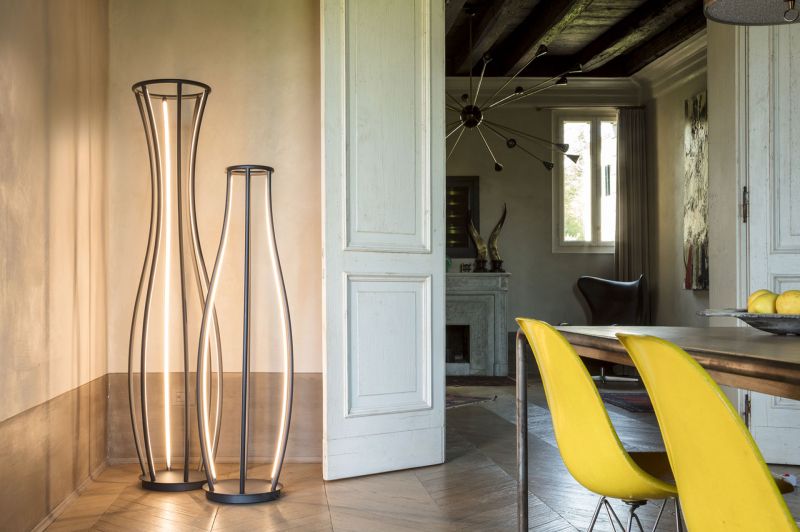 Penelope е подова лампа от извит метал, боядисана в слюдесто черно, с димируема LED светлина. Предлага се в две височини. Penelope е родена от синтеза на знак, извиващ се и хармоничен като перфектния профил на жена. Профил, който помещава източник на светлина вътре, умело съчетавайки форма и функция.