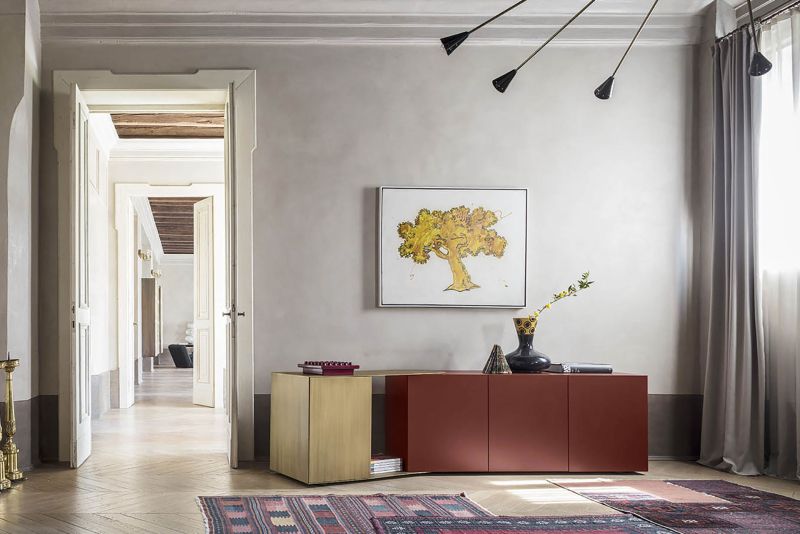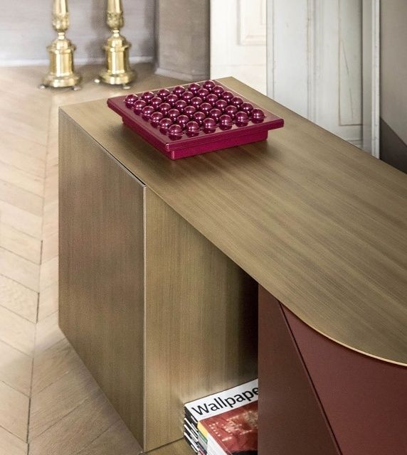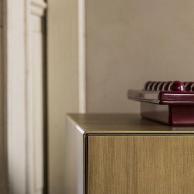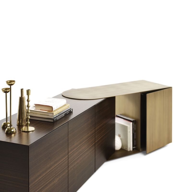 Стенният шкаф Partout и бюфетът Partout са шкафове за съхранение с конструкция от MDF, лакиран във всички цветове според картата с мостри или покрит с опушено евкалиптово дърво, и регулируем метален елемент с полирано покритие или патиниран бронз. И двата шкафа за съхранение с линеен и геометричен дизайн с отворени и затворени обеми могат да доведат до правоъгълни форми и ъглови решения. Всъщност, благодарение на регулируемия метален елемент Partout може да следва отворени и затворени ъгли, създавайки непрекъснатост по стените.