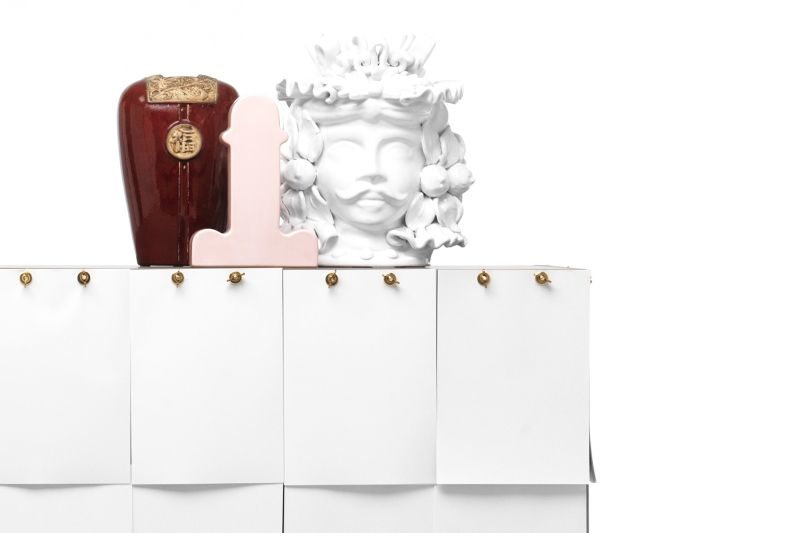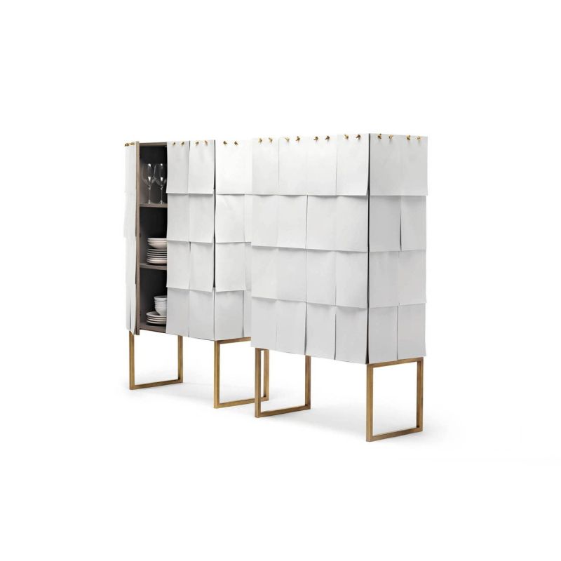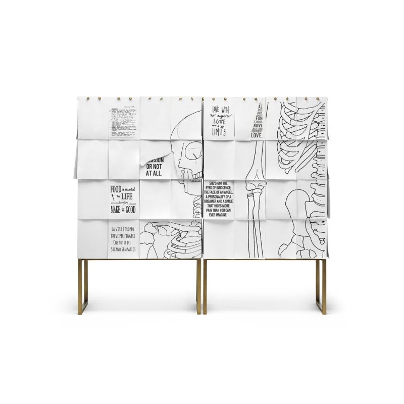 Notes е шкаф за съхранение с конструкция от сив Valcromat MDF, с предна и странична облицовка, покрити с листове хартия A4, които се припокриват и могат да се сменят. Основата е от метал с патинирано бронзово покритие. За да напишете каквото искате: списък за пазаруване, съобщение, рецепта, Notes винаги може да се променя и винаги да бъде уникален, персонализиран от потребителя.