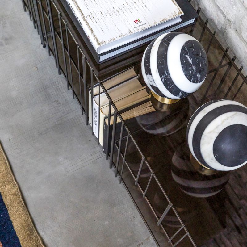 Метален телевизионен шкаф Metrica с опростена конструкция, чийто ритъм се определя от железни пръти, закрепени на различни интервали, където обектите допълват формата си, създавайки нови композиции от време на време.