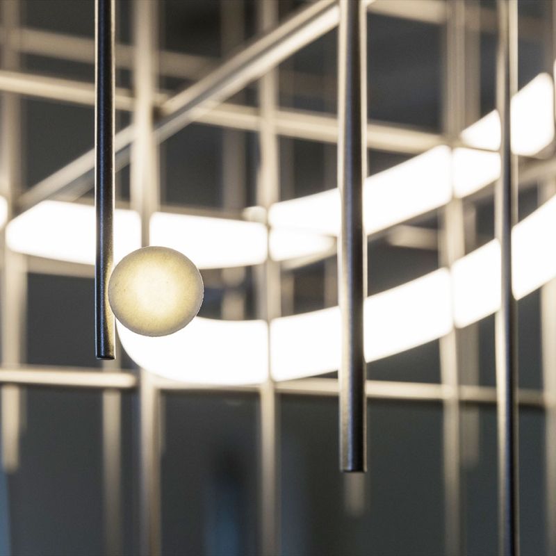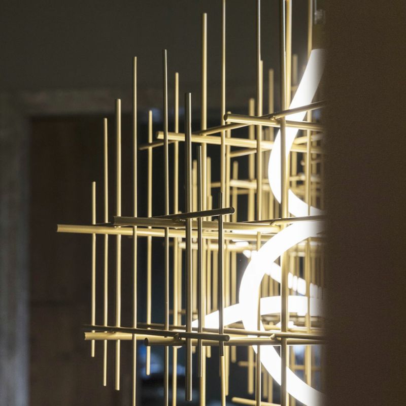 Висяща лампа с метална конструкция, предлагана в полирани и златни покрития, с 360° LED тръба. Структурата е семпла и строга, ритъмът е обозначен от железни пръти, закрепени на различни интервали, светлинната тръба няма ограничения и ви кани да се изгубите в ритъма на сенки и отражения, винаги различни.