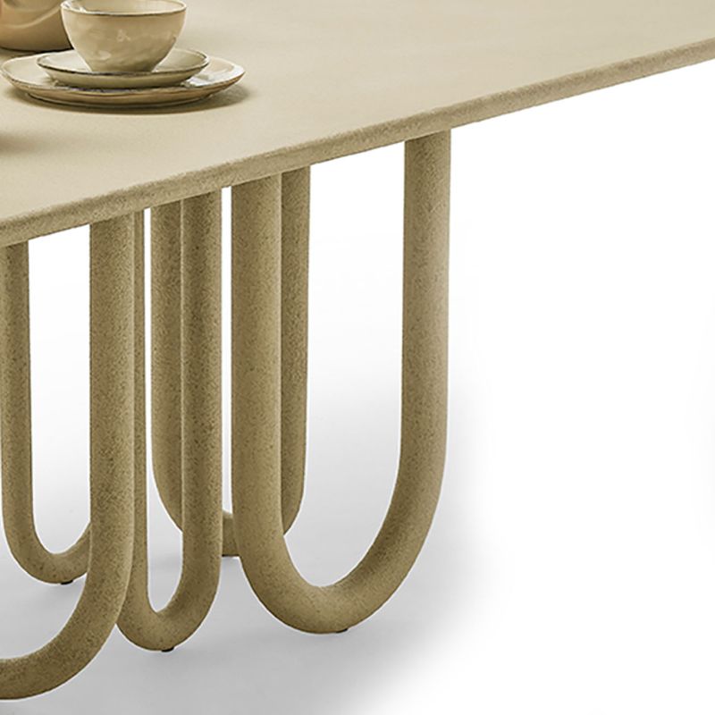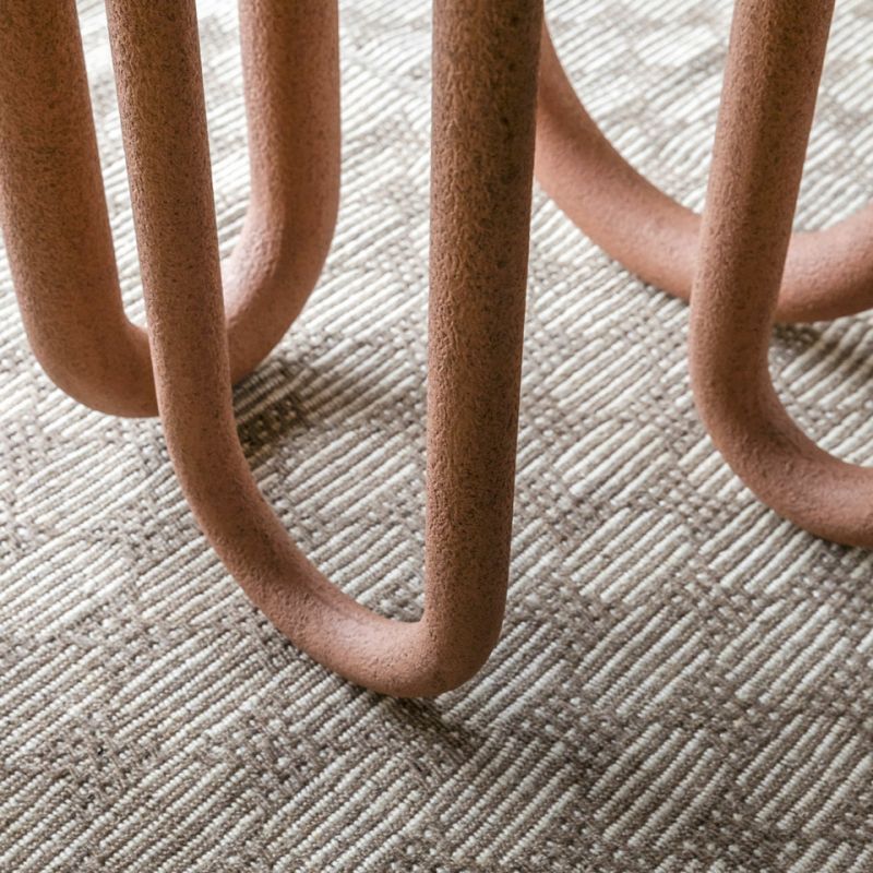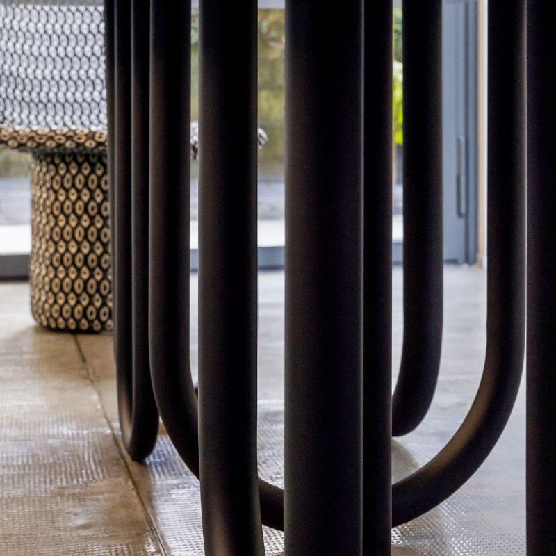 Маса с метална основа и дървен плот. Предлага се в следните варианти: прахово боядисана в черно, матова или гланцирана, лакирана във всички цветове по мостри или текстурирана, ръчно нанесена в цветове по мостри. Обърнатите арки като крака я правят вечна мебел, която се вписва безпроблемно във всяко пространство, независимо дали е традиционно или модерно.