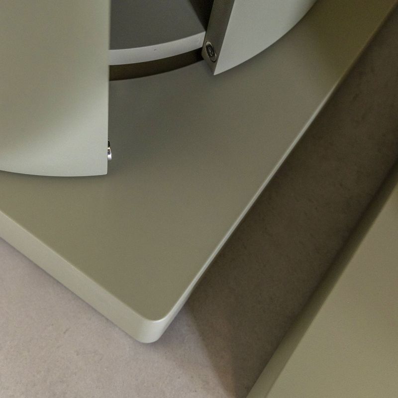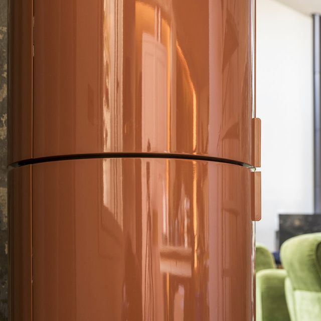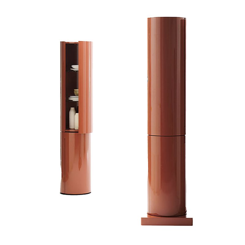 LA DORI е минималистичен, есенциален, кръгъл контейнер, без опори, така че може да се разкрие чрез завъртане. Структурата е изработена от извит шперплат, матов или гланцов лакиран във всички цветове според мострите, а основата е налична в лакирана форма на пчелна пита като колоната или в черен метал.