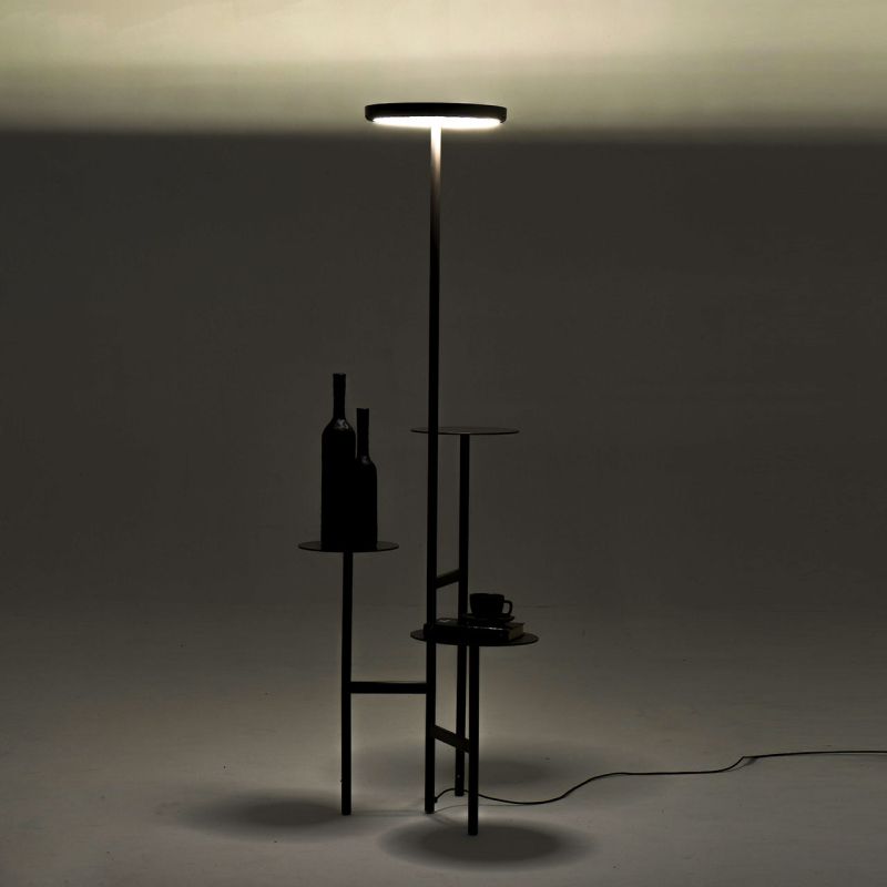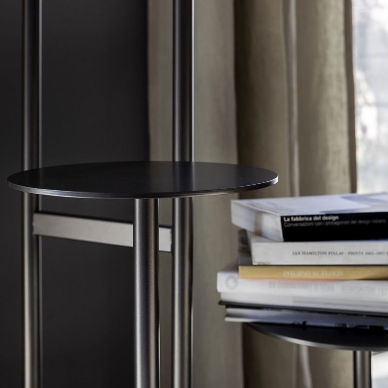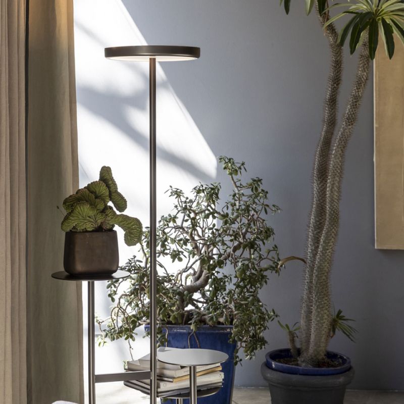 Метална лампа, която съчетава светлина и подпорни места по елегантен и съвременен начин. Предмети или растения могат да се превърнат в главни герои на този елемент с изчистен и линеен дизайн, който, заедно с осветителната си функция, винаги се обновява, превръщайки се в „уникално произведение“ всеки път.